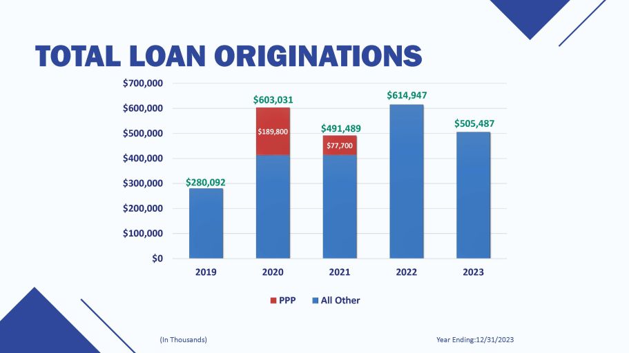 TOTAL LOAN ORIGINATIONS Year Ending:12/31/2023 (In Thousands) $280,092 $614,947 $491,489 $603,031 $505,487 $189,800 $77,700 $200,000 $100,000 $0 $300,000 $400,000 $500,000 $600,000 $700,000 2019 2020 2021 2022 2023 PPP All Other