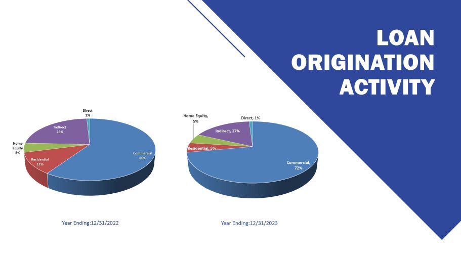 LOAN ORIGINATION ACTIVITY Year Ending:12/31/2022 Year Ending:12/31/2023 Commercial 60% Residential 11% Home Equity 5% Indirect 23% Direct 1% Commercial, 72% Residential, 5% Home Equity, 5% Indirect, 17% Direct, 1%