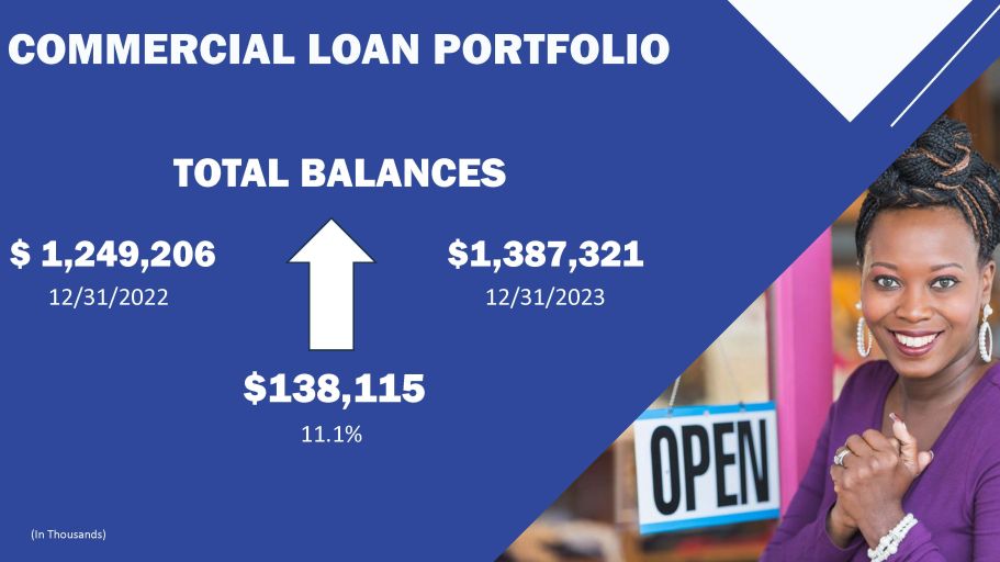 COMMERCIAL LOAN PORTFOLIO $ 1,249,206 12/31/2022 $138,115 11.1% $1,387,321 12/31/2023 TOTAL BALANCES (In Thousands)
