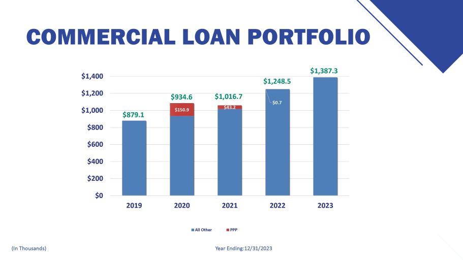 COMMERCIAL LOAN PORTFOLIO Year Ending:12/31/2023 (In Thousands) $879.1 $1,248.5 $1,387.3 $934.6 $150.9 $1,016.7 $43.2 $0.7 $800 $600 $400 $200 $0 $1,000 $1,200 $1,400 2019 2020 2021 2022 2023 All Other PPP