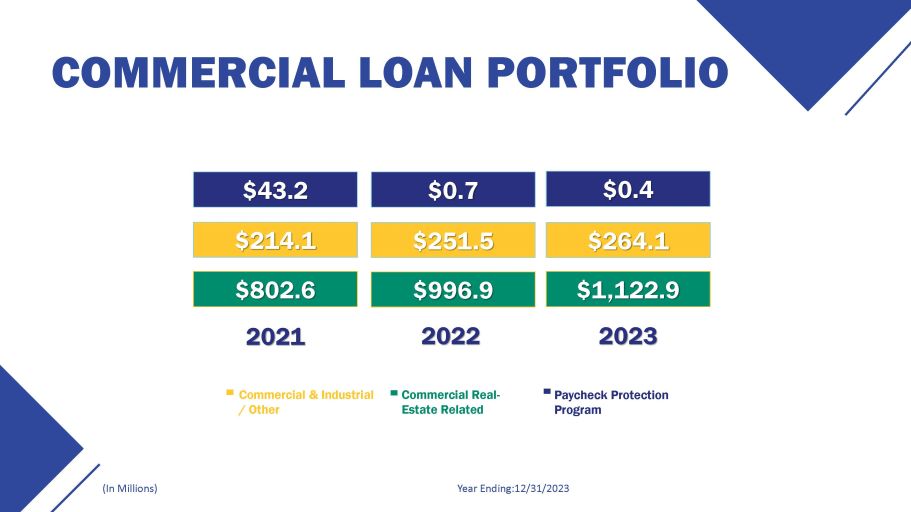 COMMERCIAL LOAN PORTFOLIO Year Ending:12/31/2023 (In Millions) 2021 2022 2023 $996.9 $251.5 $0.7 $0.4 $264.1 $1,122.9 $43.2 $802.6 $214.1 Commercial & Industrial / Other Commercial Real - Estate Related Paycheck Protection Program