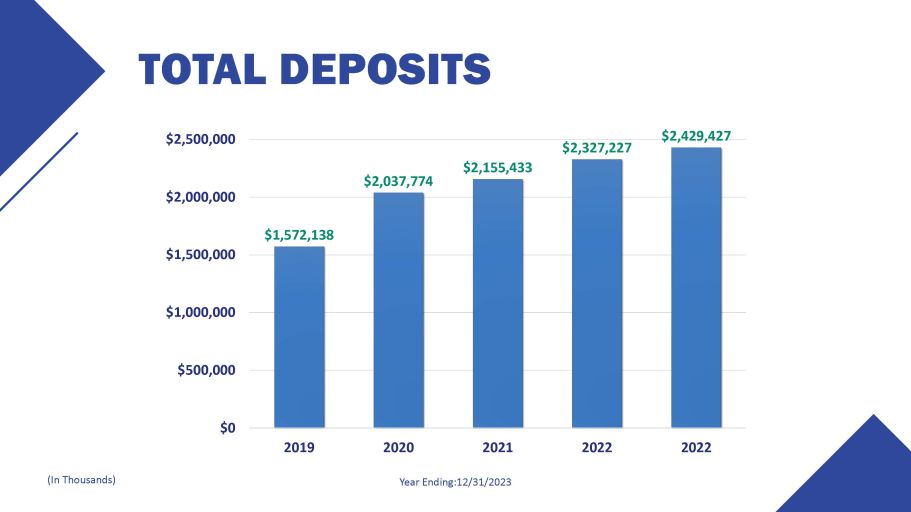 TOTAL DEPOSITS 2020 2021 Year Ending:12/31/2023 (In Thousands) $2,155,433 $2,037,774 $2,327,227 $2,429,427 $2,000,000 $1,572,138 $1,500,000 $1,000,000 $500,000 $0 $2,500,000 2019 2022 2022