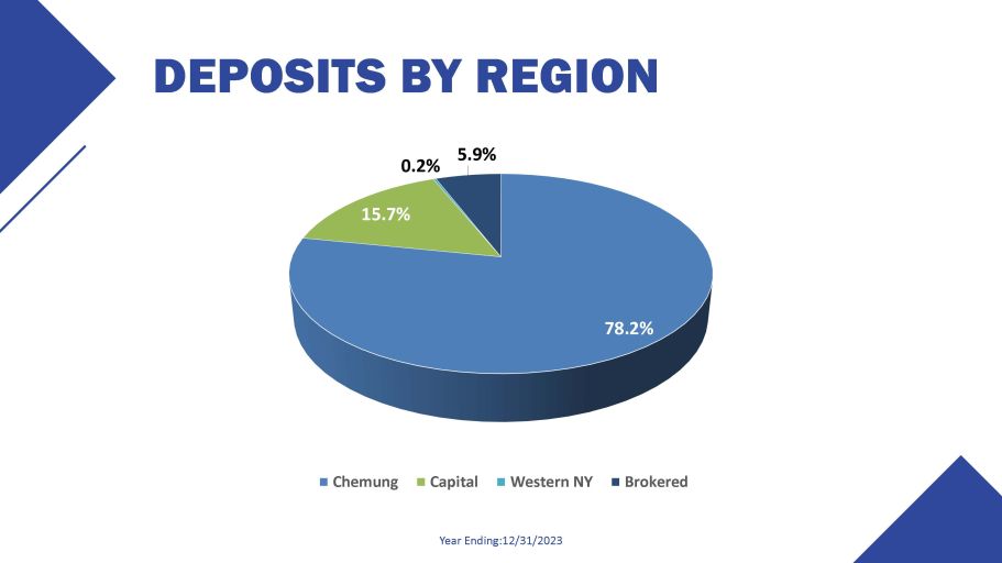 DEPOSITS BY REGION Year Ending:12/31/2023 78.2% 15.7% 0.2% 5.9% Chemung Capital Western NY Brokered