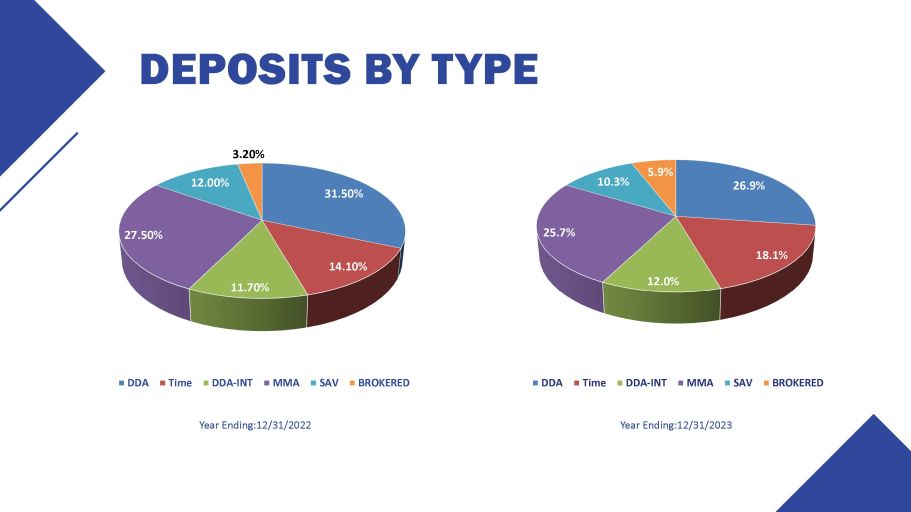 DEPOSITS BY TYPE 26.9% 18.1% 12.0% 25.7% 10.3% 5.9% DDA Time DDA - INT MMA SAV BROKERED Year Ending:12/31/2023 31.50% 14.10% 3.20% 12.00% 27.50% 11.70% DDA Time DDA - INT MMA SAV BROKERED Year Ending:12/31/2022