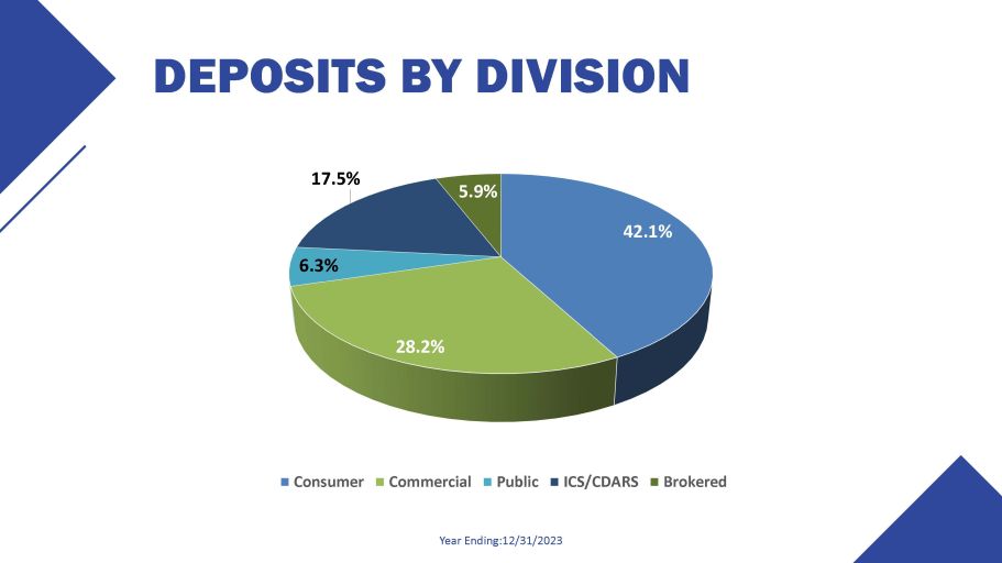 DEPOSITS BY DIVISION Year Ending:12/31/2023 42.1% 28.2% 6.3% 17.5% 5.9% Consumer Commercial Public ICS/CDARS Brokered