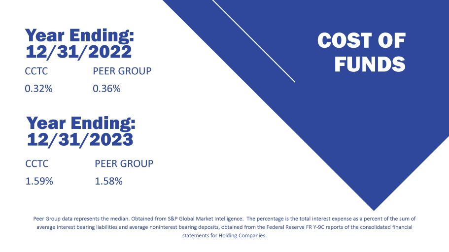 COST OF FUNDS CCTC 0.32% PEER GROUP 0.36% Year Ending: 12/31/2022 CCTC 1.59% PEER GROUP 1.58% Year Ending: 12/31/2023 Peer Group data represents the median. Obtained from S&P Global Market Intelligence. The percentage is the total interest expense as a percent of the sum of average interest bearing liabilities and average noninterest bearing deposits, obtained from the Federal Reserve FR Y - 9C reports of the consolidated financial statements for Holding Companies.