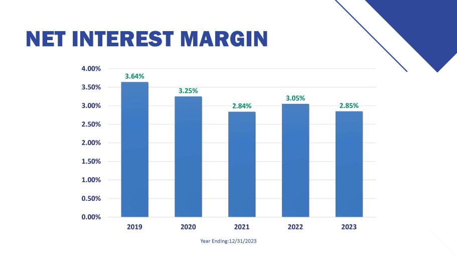 NET INTEREST MARGIN Year Ending:12/31/2023 4.00% 3.64% 3.25% 2.84% 3.05% 2.85% 2.50% 2.00% 1.50% 1.00% 0.50% 0.00% 3.00% 3.50% 2019 2020 2021 2022 2023