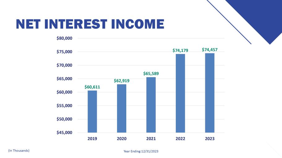 NET INTEREST INCOME 2020 2021 Year Ending:12/31/2023 (In Thousands) $62,919 $65,589 $60,611 $60,000 $55,000 $50,000 $45,000 $74,179 $74,457 $65,000 $70,000 $75,000 $80,000 2019 2022 2023