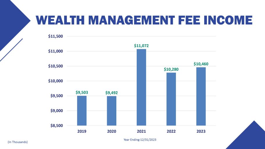 WEALTH MANAGEMENT FEE INCOME Year Ending:12/31/2023 (In Thousands) $9,503 $9,492 $11,072 $10,280 $10,460 $9,000 $8,500 $9,500 $10,000 $10,500 $11,000 $11,500 2019 2020 2021 2022 2023