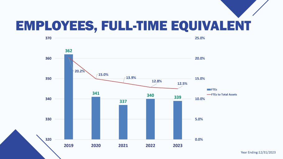 Year Ending:12/31/2023 362 341 337 340 339 20.2% 15.0% 13.9% 12.8% 12.5% 0.0% 5.0% 10.0% 15.0% 20.0% 320 330 340 350 360 EMPLOYEES, FULL - TIME EQUIVALENT 370 25.0% 2019 2020 2021 2022 2023 FTEs FTEs to Total Assets