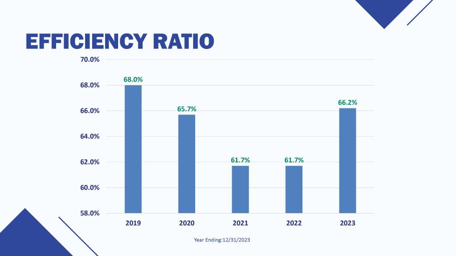EFFICIENCY RATIO 68.0% 65.7% 61.7% 61.7% 66.2% 60.0% 58.0% 62.0% 64.0% 66.0% 68.0% 70.0% 2019 2020 2021 Year Ending:12/31/2023 2022 2023