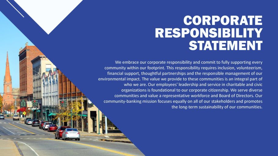 CORPORATE RESPONSIBILITY STATEMENT We embrace our corporate responsibility and commit to fully supporting every community within our footprint. This responsibility requires inclusion, volunteerism, financial support, thoughtful partnerships and the responsible management of our environmental impact. The value we provide to these communities is an integral part of who we are. Our employees' leadership and service in charitable and civic organizations is foundational to our corporate citizenship. We serve diverse communities and value a representative workforce and Board of Directors. Our community - banking mission focuses equally on all of our stakeholders and promotes the long - term sustainability of our communities.