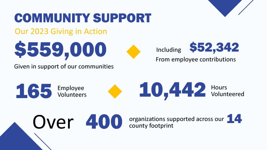 COMMUNITY SUPPORT Our 2023 Giving in Action $559,000 Given in support of our communities $52,342 Including From employee contributions Hours Volunteered 10,442 Employee Volunteers 165 county footprint Over 400 organizations supported across our 14