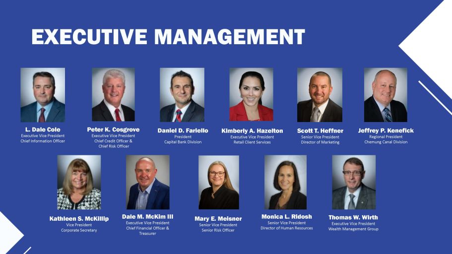 EXECUTIVE MANAGEMENT L. Dale Cole Executive Vice President Chief Information Officer Daniel D. Fariello President Capital Bank Division Kimberly A. Hazelton Executive Vice President Retail Client Services Scott T. Heffner Senior Vice President Director of Marketing Kathleen S. McKillip Vice President Corporate Secretary Dale M. McKim III Executive Vice President Chief Financial Officer & Treasurer Thomas W. Wirth Executive Vice President Wealth Management Group Peter K. Cosgrove Executive Vice President Chief Credit Officer & Chief Risk Officer Mary E. Meisner Senior Vice President Senior Risk Officer Jeffrey P. Kenefick Regional President Chemung Canal Division Monica L. Ridosh Senior Vice President Director of Human Resources