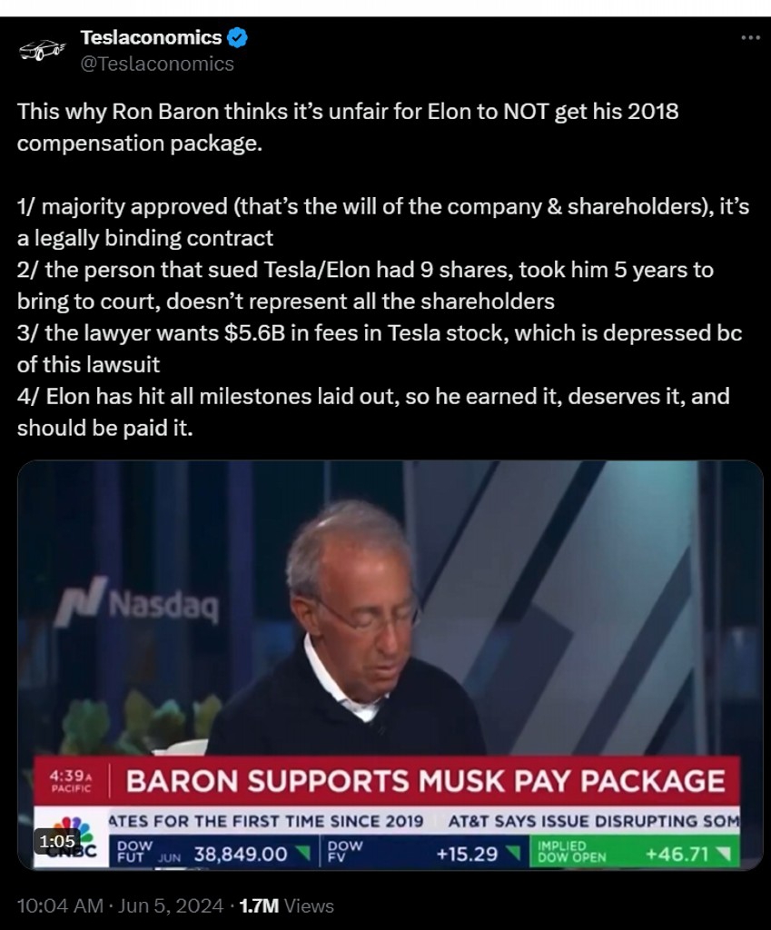 […] And the lawyer who represented them, […] when you talk about getting lucky, he has applied to the court for payment of $5.6 billion. $5.6 billion. […] And then, he is asking for the payment to be made in shares of Tesla stock, which are depressed because of this lawsuit. It's crazy. And […] so, I think that […], you know, it's really unfair, the way they're addressing this, and I think that […] he earned it, and he deserves it, and he should be paid it.