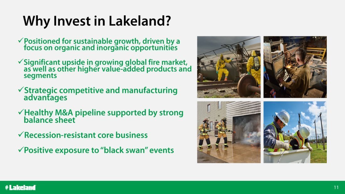 Mr. Jenkins continued, “We continue to actively pursue attractive opportunities to expand our global fire services business, and in early April of this year, we announced the signing of an agreement to acquire the fire and rescue business of LHD Group. Along with the United States, Germany and Australia are “top-three” global fire markets, and LHD’s fire and rescue offerings bring Lakeland a premium product portfolio and complementary geographic footprints in Germany, Australia and Hong Kong. LHD also brings a recurring revenue LHD Care service offerings, which increases customer retention and which we expect to leverage and expand globally. We are continuing to make progress on this transaction, and we anticipate closing in June once the final closing condition is cleared.