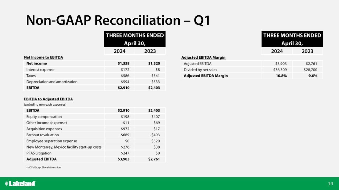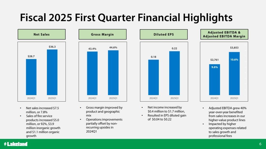 Roger Shannon, Lakeland’s Chief Financial Officer, added, “During the fiscal first quarter, Lakeland delivered strong year-over-year first-quarter sales and profitability growth resulting from our geographic and end-market diversity, strong sales growth and margin improvement. Revenue grew 27% compared to the first quarter of fiscal year 2024. We increased Operating Profit by 14% to $2.2 million and Adjusted EBITDA by $1.1M, or 40%, to $3.9 million. Gross margin increased by 1.2 margin points to 44.6%, driven by positive organic sales mix and other operating improvements. While our operating expenses increased to $14.0 million for the quarter, $1.2 million of the increase was due to acquisition, non-cash and non-recurring expenses, and acquired and sales-growth-related expenses accounted for $1.8 million of the increase. Net income and Earnings per Share increased by 25% and 24%, respectively. Our continued focus on inventory reduction and generating Cash Flow resulted in an $8.6 million reduction, excluding the effects of acquisitions, in our inventory year-over-year, mainly driven by a 21% decrease in finished goods inventory. Our balance sheet remains strong as we finished Q1-FY25 with $28.4 million of cash and total long-term debt of $13 million.