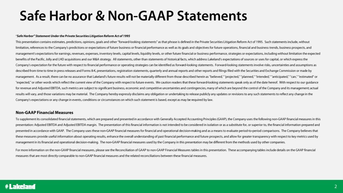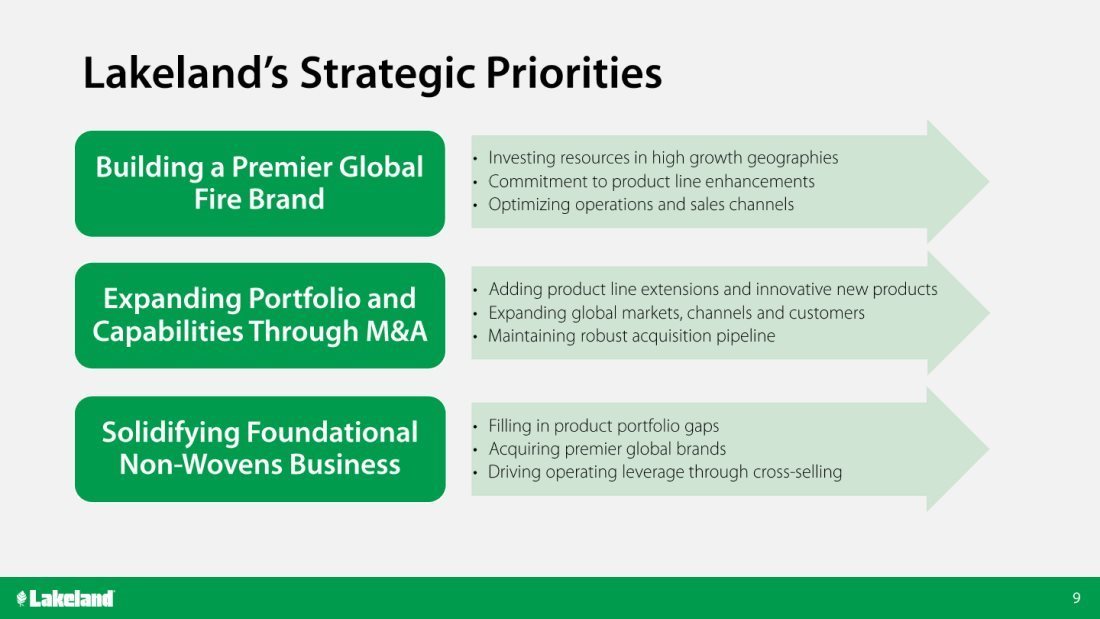 “We also are encouraged by the sales results from our recent acquisitions as we saw combined sales of $3.9 million from Pacific Helmets, which we acquired last November, and Jolly Scarpe, which closed on February 5th of this year and completed Lakeland’s “head-to-toe” fire product offering,” added Mr. Jenkins. “Over the coming months, we will continue to integrate Pacific’s and Jolly’s outstanding fire safety products into Lakeland’s global sales channels and marketing platforms as we work to proactively leverage synergies across our global portfolio through market expansion and cross-selling opportunities. Our fire services business, a key strategic growth focus for the Company, grew over 92% versus the same period last year, driven both by our Jolly and Pacific strategic acquisitions and organic growth as a result of our superior lead times and onboarding successes with new distributors.”