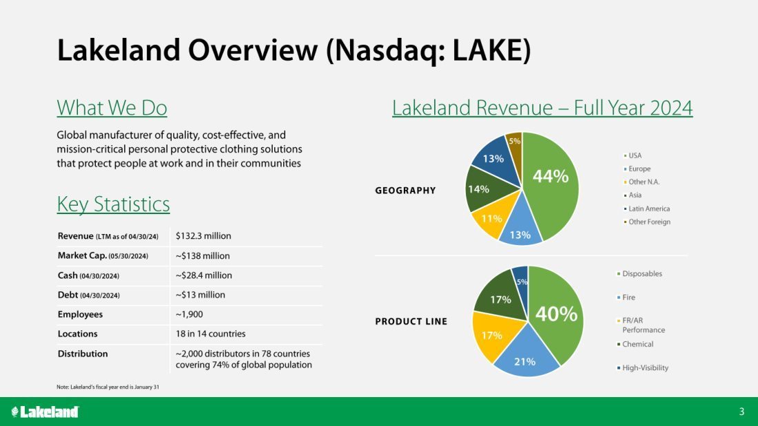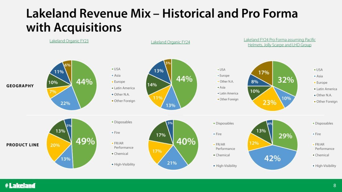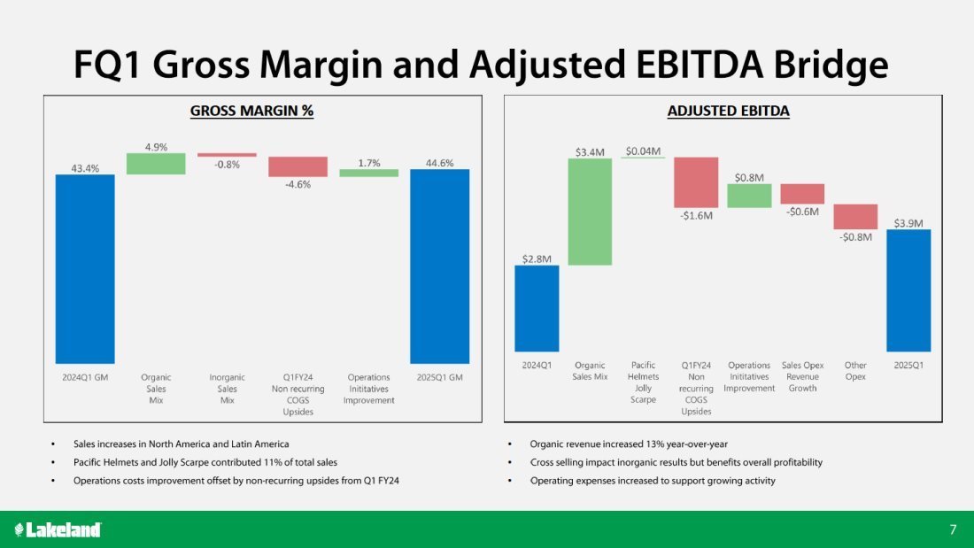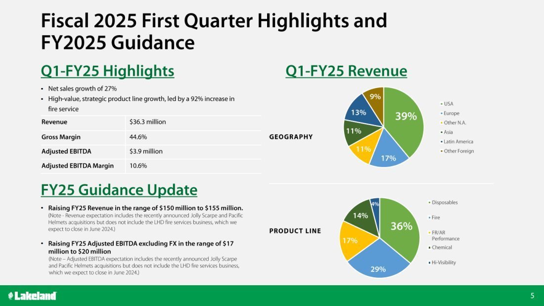 “Lakeland delivered strong first-quarter results as we continued to execute on our commitment to expand our fire services business globally through organic growth and strategic acquisitions and to accelerate the growth of our industrial safety products,” said Jim Jenkins, President, Chief Executive Officer and Executive Chairman. “Our Q1-FY25 net sales of $36.3 million is a 27% increase versus last year. We were very pleased to see organic revenue grow by $3.7 million, or 13%, year-over-year, driven by increases in our Fire, Chemical, Wovens and Disposables products. We also saw double-digit year-over-year organic growth across North and South America, including a 16% year-over-year growth in the U.S. and 54% in Latin America. While our Asian business remained soft in the first quarter, we continue to see healthy demand for our higher-value, Fire, Critical Environment, Disposables and Chemical product categories in North and South America, led by strong sales efforts and our container programs with key national customers. After quarter-end, Lakeland announced a strategic partnership with LineDrive, a leading outsourced sales & marketing company for industrial maintenance, repair and operations (“MRO”). We believe this partnership will have a significant impact on expanding Lakeland’s products to a broader audience in the North American industrial sector,” continued Mr. Jenkins.