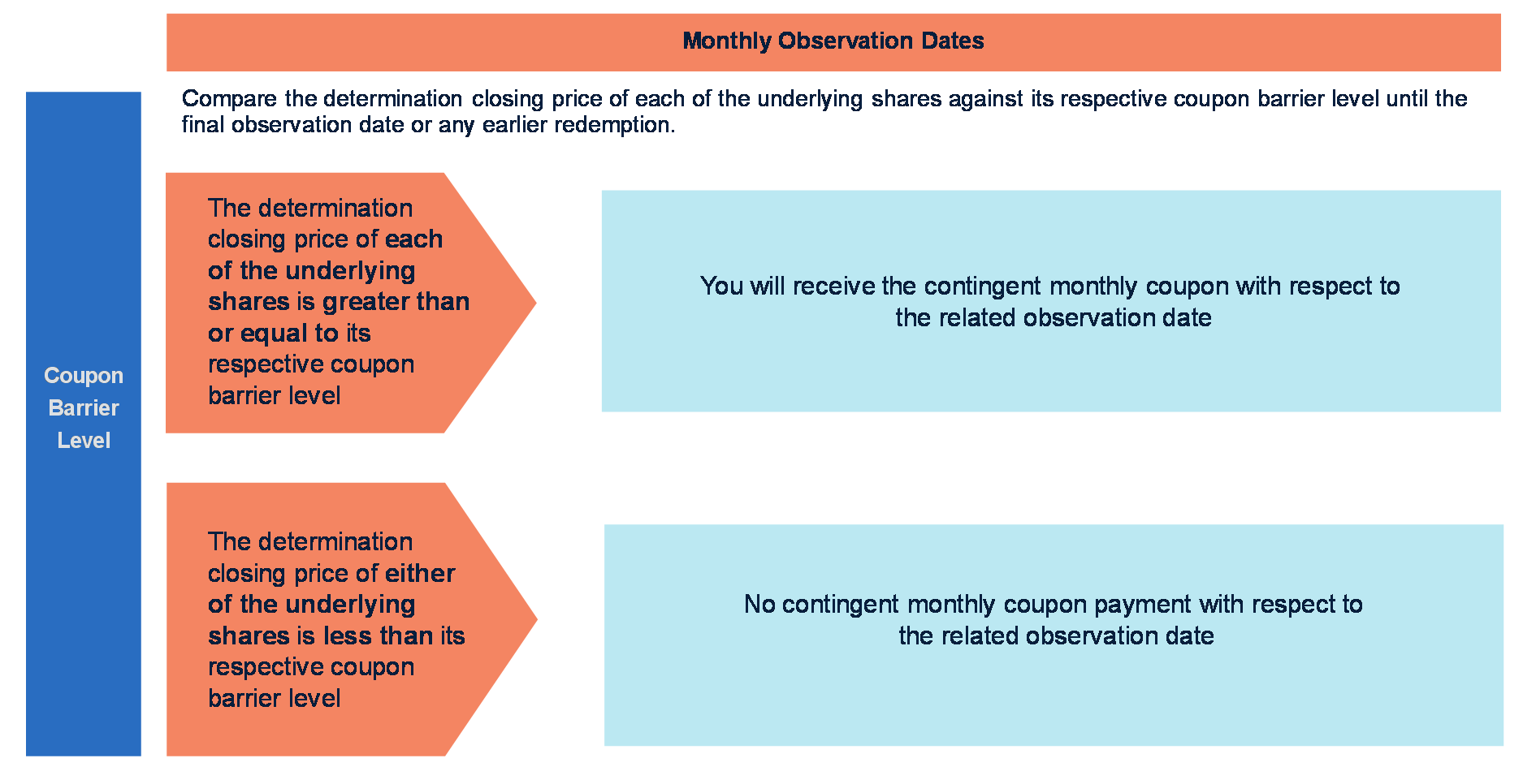 A contingent monthly coupon at an annual rate of at least 8.90% (corresponding to approximately $7.417 per month per security, to be determined on the pricing date) will be paid on the securities on each coupon payment date but only if the determination closing price of each of the underlying shares is at or above its respective coupon barrier level on the related observation date.