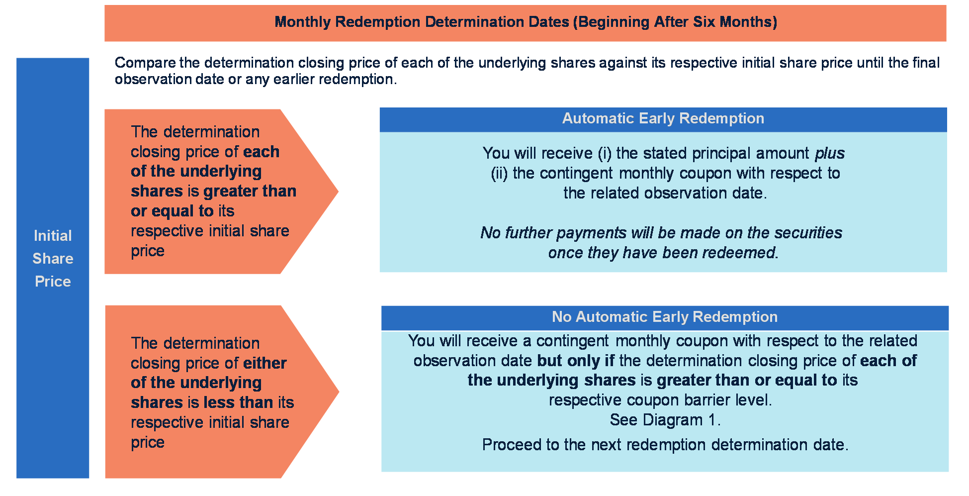 The securities are not subject to automatic early redemption until six months after the original issue date. Following this 6-month initial non-call period, if, on any redemption determination date, beginning on December 27, 2024, the determination closing price of each of the underlying shares is greater than or equal to its respective initial share price, the securities will be automatically redeemed for an early redemption payment on the related early redemption date. No further payments will be made on the securities once they have been redeemed. The securities will not be redeemed early on any early redemption date if the determination closing price of either of the underlying shares is below its respective initial share price on the related redemption determination date. |