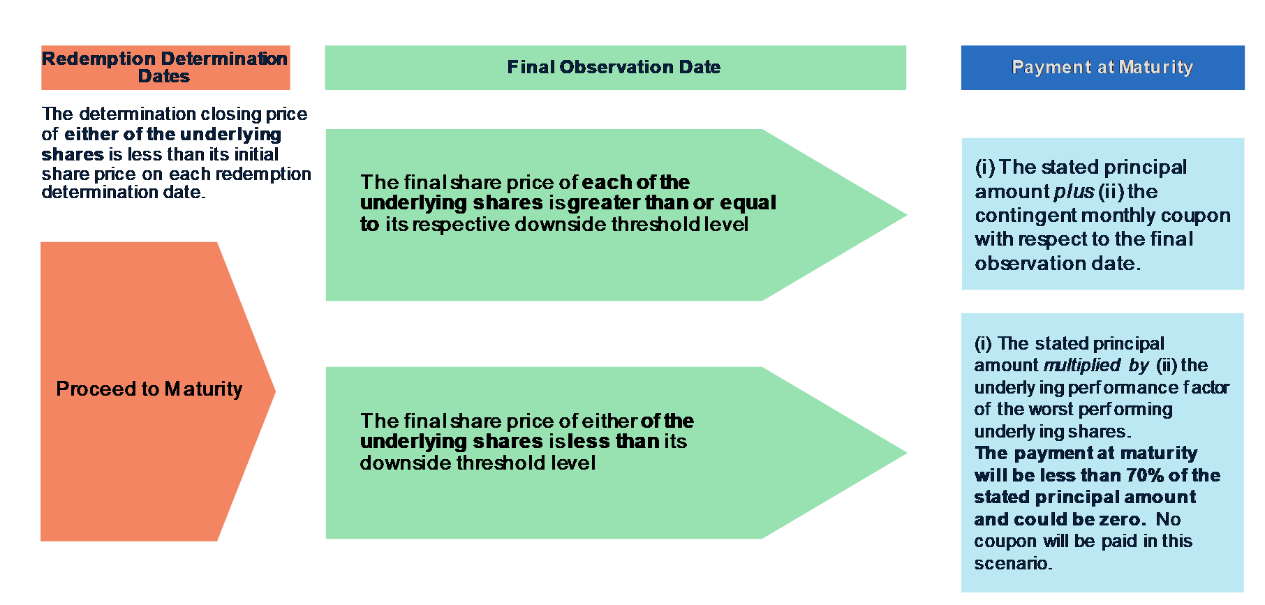 If the securities have not been automatically redeemed prior to maturity, the payment at maturity will be determined as follows: ●If the final share price of each of the underlying shares is greater than or equal to its respective downside threshold level: the stated principal amount and the contingent monthly coupon with respect to the final observation date ●If the final share price of either of the underlying shares is less than its respective downside threshold level: (i) the stated principal amount multiplied by (ii) the underlying performance factor of the worst performing underlying Under these circumstances, the payment at maturity will be less than 70% of the stated principal amount and could be zero. |