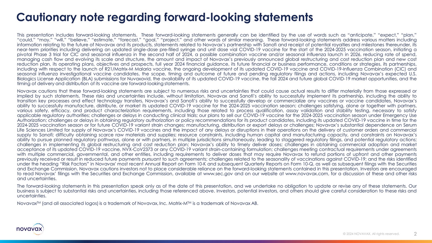 Forward-looking statements are neither historical facts nor assurances of future performance. Instead, they are based only on our current beliefs and expectations about the future of our business, future plans and strategies, projections, anticipated events and trends, the economy, and other future conditions. Forward-looking statements involve estimates, assumptions, risks, and uncertainties that could cause actual results or outcomes to differ materially from those expressed or implied in any forward-looking statements, and, therefore, you should not place considerable reliance on any such forward-looking statements. Such risks and uncertainties include, without limitation, our and Sanofi’s ability to successfully implement its partnership, including the ability to transition key processes and effect technology transfers, Novavax’s and Sanofi’s ability to successfully develop or commercialize any vaccines or vaccine candidates, our ability to successfully and timely manufacture, distribute, or market our updated COVID-19 vaccine including as a single dose vial or pre-filled product presentation for the 2024-2025 vaccination season, our plans to sell our COVID-19 vaccine for the 2024-2025 vaccination season under Emergency Use Authorization; challenges satisfying, alone or together with partners, various safety, efficacy, and product characterization requirements, including those related to process qualification, assay validation and stability testing, necessary to satisfy applicable regulatory authorities; challenges or delays in conducting clinical trials; challenges or delays in obtaining regulatory authorization for our product candidates, including our updated COVID-19 vaccine in time for the 2024-2025 vaccination season in the U.S. and in foreign jurisdictions to meet APA commitments or for future COVID-19 variant strain changes, our COVID-19-Influenza combination vaccine candidate and our stand-alone influenza vaccine candidate; manufacturing, distribution or export delays or challenges; our substantial dependence on Serum Institute of India Pvt. Ltd. and Serum Life Sciences Limited for co-formulation and filling and PCI Pharma Services for finishing our COVID-19 vaccine and the impact of any delays or disruptions in their operations on the delivery of customer orders; difficulty obtaining scarce raw materials and supplies; resource constraints, including human capital and manufacturing capacity, and constraints on our ability to pursue planned regulatory pathways, alone or with partners, in multiple jurisdictions simultaneously, leading to staggered regulatory filings, and potential regulatory actions; the potential for an unfavorable outcome in disputes; challenges in implementing our global restructuring and cost reduction plan; our ability to timely deliver doses; challenges in obtaining commercial adoption and market acceptance of our updated COVID-19 vaccine or any COVID-19 variant strain-containing formulation; challenges meeting contractual requirements under agreements with multiple commercial, governmental, and other entities, including requirements to deliver doses that may require Novavax to refund portions of upfront and other payments previously received or result in reduced future payments pursuant to such agreements; challenges related to the seasonality of vaccinations against COVID-19; and other risks and uncertainties identified in Part I, Item 1A “Risk Factors” of our Annual Report on Form 10-K for the year ended December 31, 2023, filed with the Securities and Exchange Commission (“SEC”) on February 28, 2024, and in Part II, Item 1A “Risk Factors” of our Quarterly Report on Form 10-Q for the quarter ended March 31, 2024, filed with the SEC on May 10, 2024, which may be detailed and modified or updated in other documents filed with the SEC from time to time, and are available at www.sec.gov and at www.novavax.com. You are encouraged to read these filings as they are made.