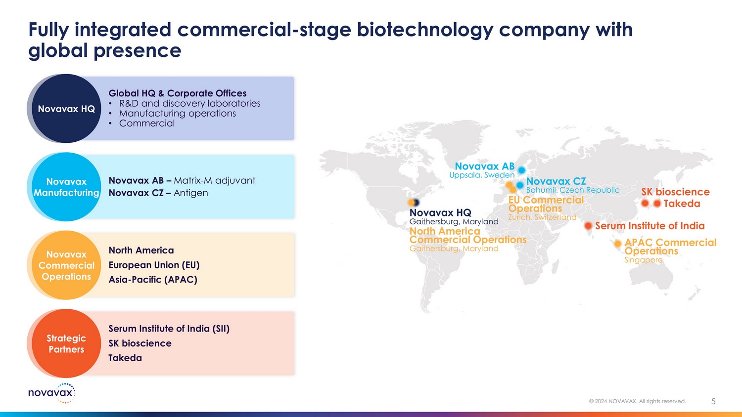 Novavax corporate highlights 4 © 2024 NOVAVAX. All rights reserved. Positioned for long - term value creation through commercialization of proven technology Proprietary Matrix - M TM adjuvant differentiates pipeline Rapidly advancing COVID - 19 - Influenza Combination (CIC) vaccine to Phase 3 Proven p rotein - based technology platform COVID - 19 vaccine positioned to gain share in long - term market Fully integrated commercial - stage biotechnology company