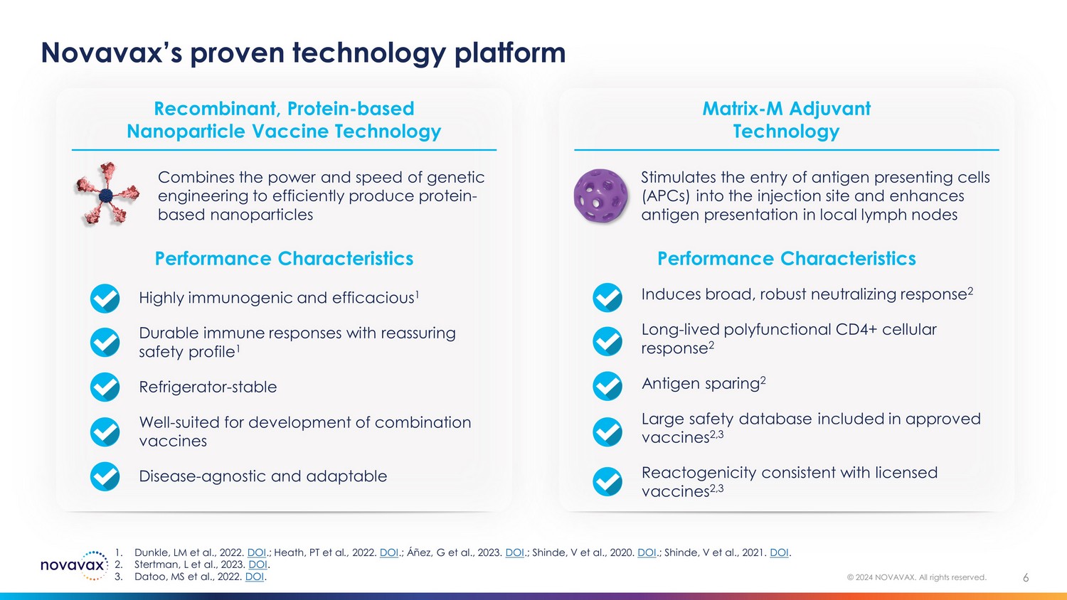 Fully integrated commercial - stage biotechnology company with global presence 5 © 2024 NOVAVAX. All rights reserved. Global HQ & Corporate Offices • R&D and discovery laboratories • Manufacturing operations • Commercial Novavax HQ Novavax HQ Gaithersburg, Maryland Novavax AB Uppsala, Sweden Novavax CZ Bohumil, Czech Republic Serum Institute of India SK bioscience Takeda EU Commercial Operations Zurich, Switzerland APAC Commercial Operations Singapore Novavax AB – Matrix - M adjuvant Novavax CZ – Antigen Novavax Manufacturing North America European Union (EU) Asia - Pacific (APAC) Novavax Commercial Operations Serum Institute of India (SII) SK bioscience Takeda Strategic Partners North America Commercial Operations Gaithersburg, Maryland