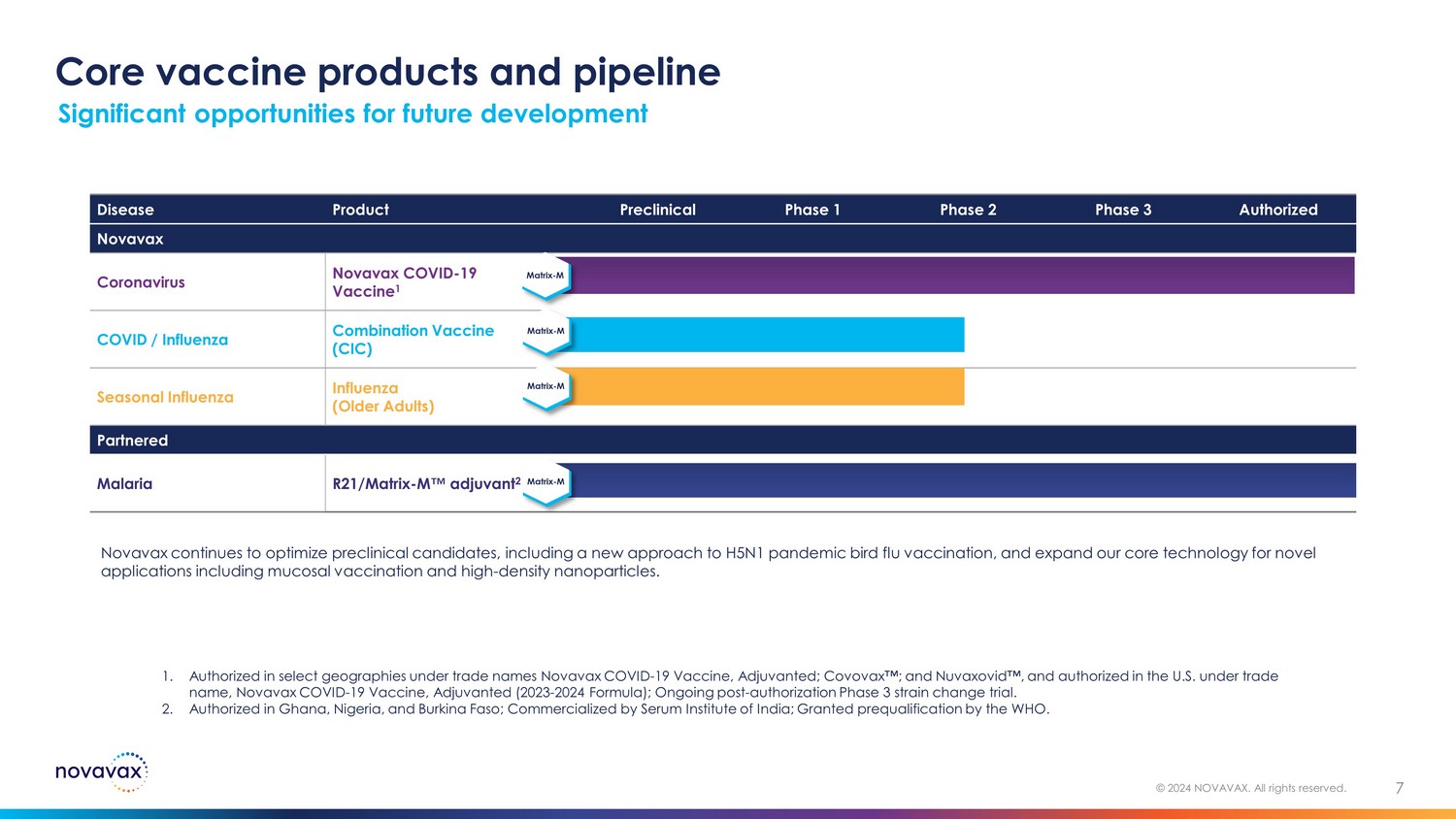 Novavax’s proven technology platform 6 © 2024 NOVAVAX. All rights reserved. • Induces broad, robust neutralizing response 2 • Long - lived polyfunctional CD4+ cellular response 2 • Antigen sparing 2 • Large safety database included in approved vaccines 2,3 • Reactogenicity consistent with licensed vaccines 2,3 Matrix - M Adjuvant Technology Performance Characteristics Stimulates the entry of antigen presenting cells (APCs) into the injection site and enhances antigen presentation in local lymph nodes • Highly immunogenic and efficacious 1 • Durable immune responses with reassuring safety profile 1 • Refrigerator - stable • Well - suited for development of combination vaccines • Disease - agnostic and adaptable Recombinant, Protein - based Nanoparticle Vaccine Technology Performance Characteristics Combines the power and speed of genetic engineering to efficiently produce protein - based nanoparticles 1. Dunkle, LM et al., 2022. DOI .; Heath, PT et al ., 2022 . DOI .; Áñez , G et al., 2023. DOI . ; Shinde, V et al., 2020. DOI . ; Shinde, V et al., 2021. DOI . 2. Stertman , L et al., 2023. DOI . 3. Datoo , MS et al., 2022. DOI .