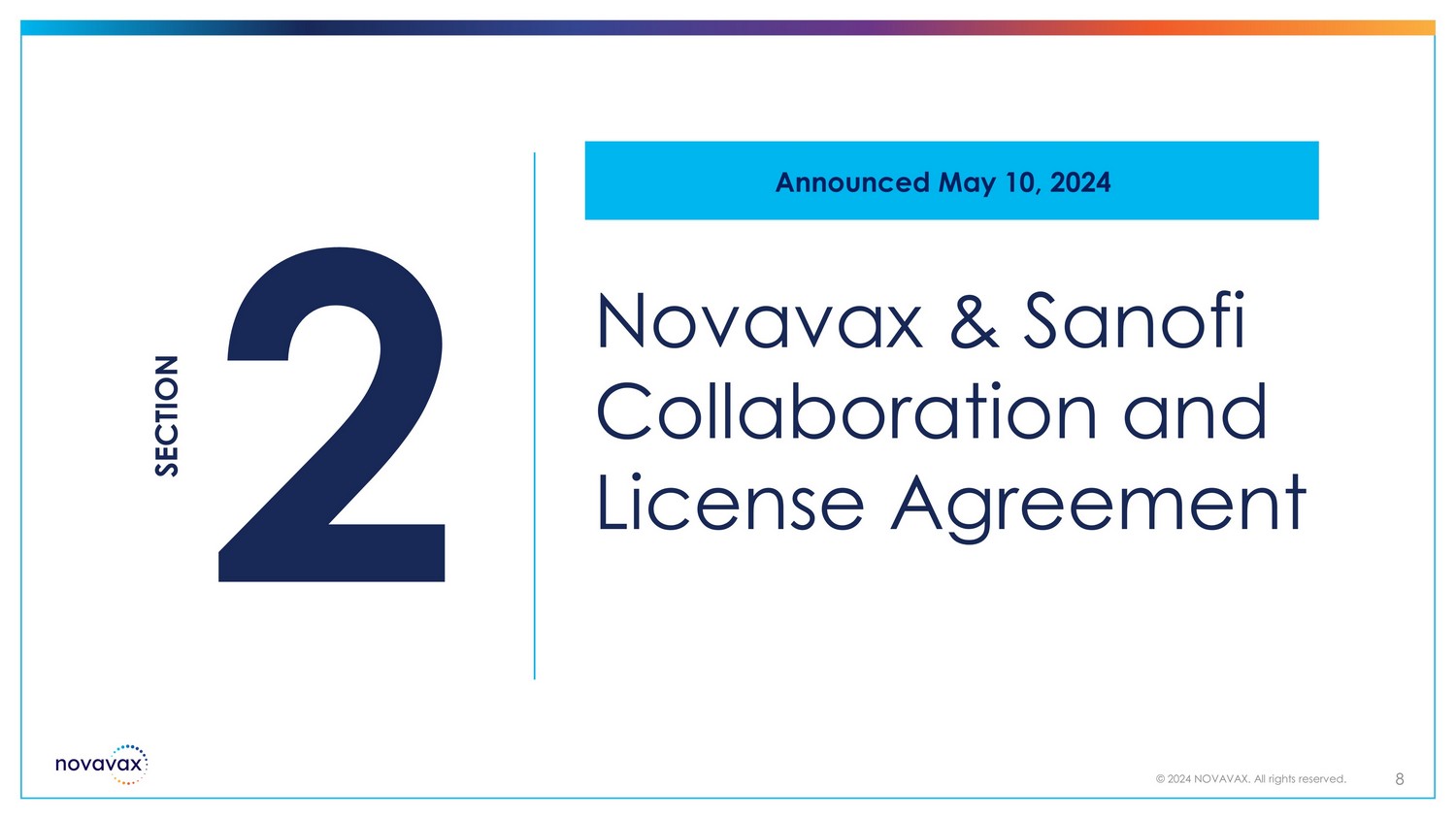 Novavax & Sanofi Collaboration and License Agreement SECTION 8 © 2024 NOVAVAX. All rights reserved. Announced May 10, 2024