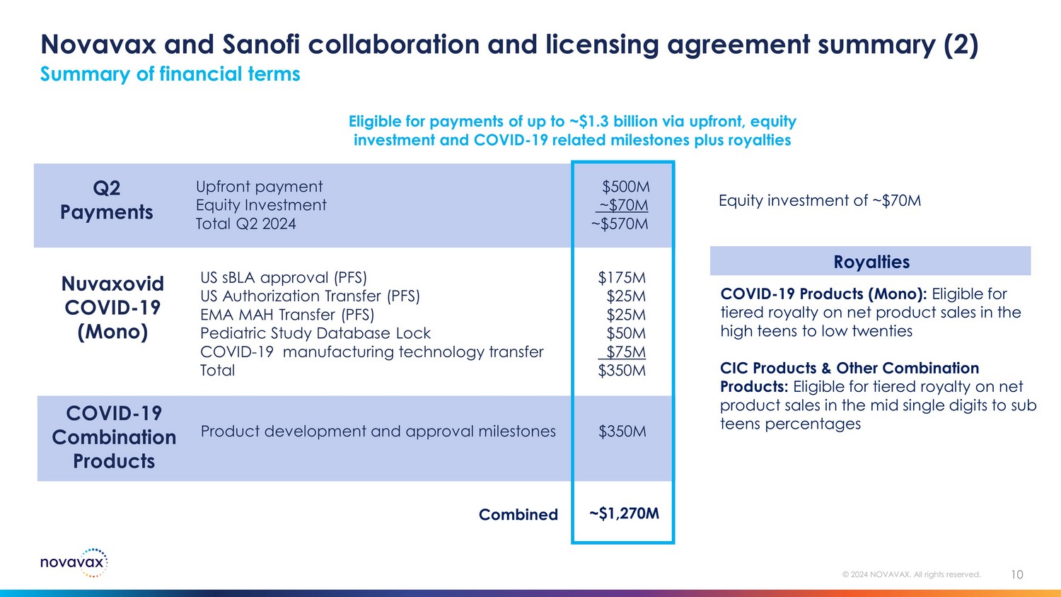 Novavax and Sanofi collaboration and licensing agreement summary This agreement is a further validation of our technology platform and provides significant opportunity to drive value creation and benefit global public health 9 © 2024 NOVAVAX. All rights reserved. A multi - billion dollar potential across upfronts, equity investment, milestones and royalties C o - exclusive license to co - commercialize Novavax’s current stand - alone adjuvanted COVID - 19 vaccine worldwide* Sole license to Novavax’s adjuvanted COVID - 19 vaccine for use in combination with Sanofi’s flu vaccines ** Non - exclusive license to use the Matrix - M adjuvant in vaccine products Sanofi made a minority (<5%) equity investment in Novavax jdsfm * Except in countries with existing Advance Purchase Agreements and in India, Japan, and South Korea where Novavax has existing partnership agreements ** Novavax retains the right to develop its own Covid - 19 / Flu combination product using its Covid - 19 and internally developed flu vaccine
