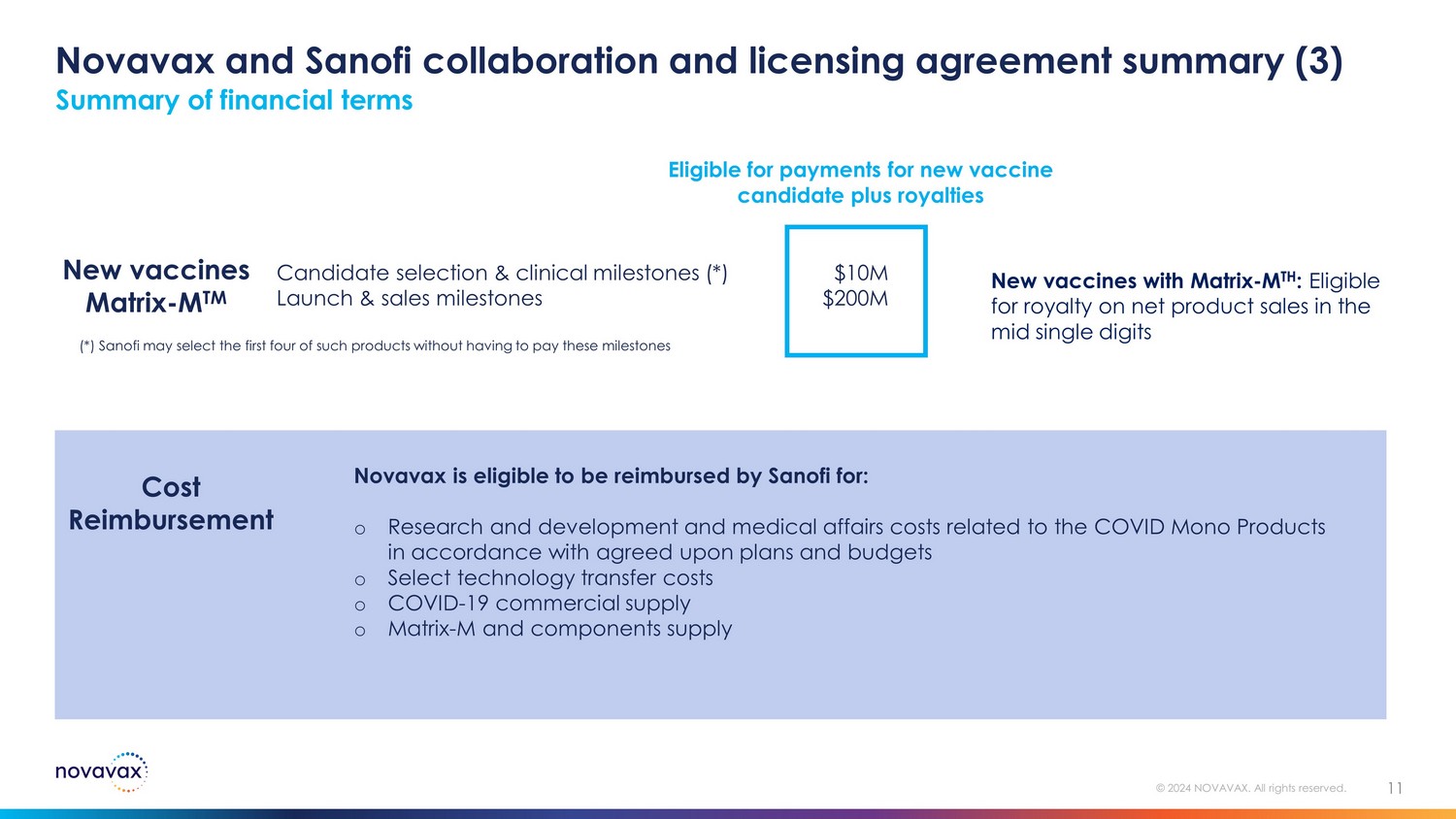 Novavax and Sanofi collaboration and licensing agreement summary (2) Upfront payment $500M Equity Investment ~$70M Total Q2 2024 ~$570M US sBLA approval (PFS) $175M US Authorization Transfer (PFS) $25M EMA MAH Transfer (PFS) $25M Pediatric Study Database Lock $50M COVID - 19 manufacturing technology transfer $75M Total $350M Summary of financial terms Q2 Payments Nuvaxovid COVID - 19 (Mono) Product development and approval milestones $350M COVID - 19 Combination Products Equity investment of ~$70M COVID - 19 Products (Mono): Eligible for tiered royalty on net product sales in the high teens to low twenties CIC Products & Other Combination Products: Eligible for tiered royalty on net product sales in the mid single digits to sub teens percentages Eligible for payments of up to ~$1.3 billion via upfront, equity investment and COVID - 19 related milestones plus royalties ~$1,270M Combined 10 © 2024 NOVAVAX. All rights reserved. Royalties