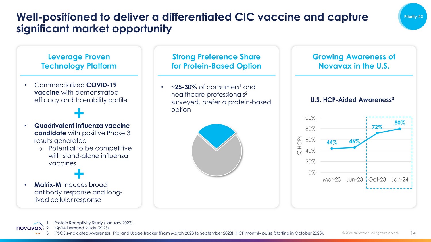 14 © 2024 NOVAVAX. All rights reserved. Well - positioned to deliver a differentiated CIC vaccine and capture significant market opportunity Leverage Proven Technology Platform 1. Protein Receptivity Study (January 2022). 2. IQVIA Demand Study (2023). 3. IPSOS syndicated Awareness, Trial and Usage tracker (From March 2023 to September 2023), HCP monthly pulse (starting in Octob er 2023). • ~25 - 30% of consumers 1 and healthcare professionals 2 surveyed, prefer a protein - based option Growing Awareness of Novavax in the U.S. 44% 46% 72% 80% 0% 20% 40% 60% 80% 100% Mar-23 Jun-23 Oct-23 Jan-24 % HCPs Strong Preference Share for Protein - Based Option • Commercialized COVID - 19 vaccine with demonstrated efficacy and tolerability profile • Matrix - M induces broad antibody response and long - lived cellular response • Quadrivalent influenza vaccine candidate with positive Phase 3 results generated o Potential to be competitive with stand - alone influenza vaccines U.S. HCP - Aided Awareness 3 Priority #2