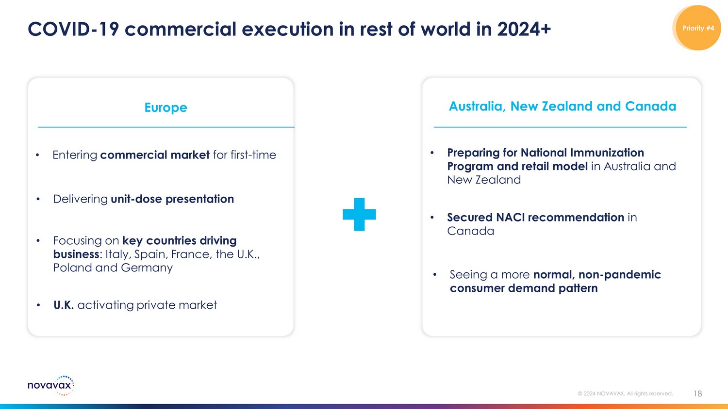 Setting the stage for a stronger U.S. commercial performance in 2024+ 2024 - 2025 Vaccination Season Goals Single - dose pre - filled syringe Product Presentation Timing of Product at Distribution Centers Ready to be Shipped Market Access Marketing Efforts 17 © 2024 NOVAVAX. All rights reserved. Targeting August 2024 National and Regional Retail Large IDNs and HMOs EUA for updated strain in PFS pending FDA Authorization Status Retail channel: Focus on 60+ consumer segments Priority #4