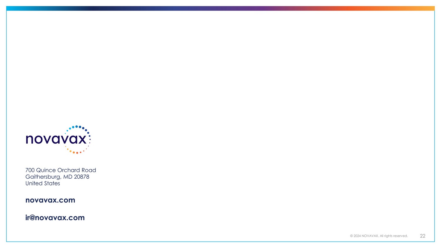 700 Quince Orchard Road Gaithersburg, MD 20878 United States novavax.com ir@novavax.com © 2024 NOVAVAX. All rights reserved. 22