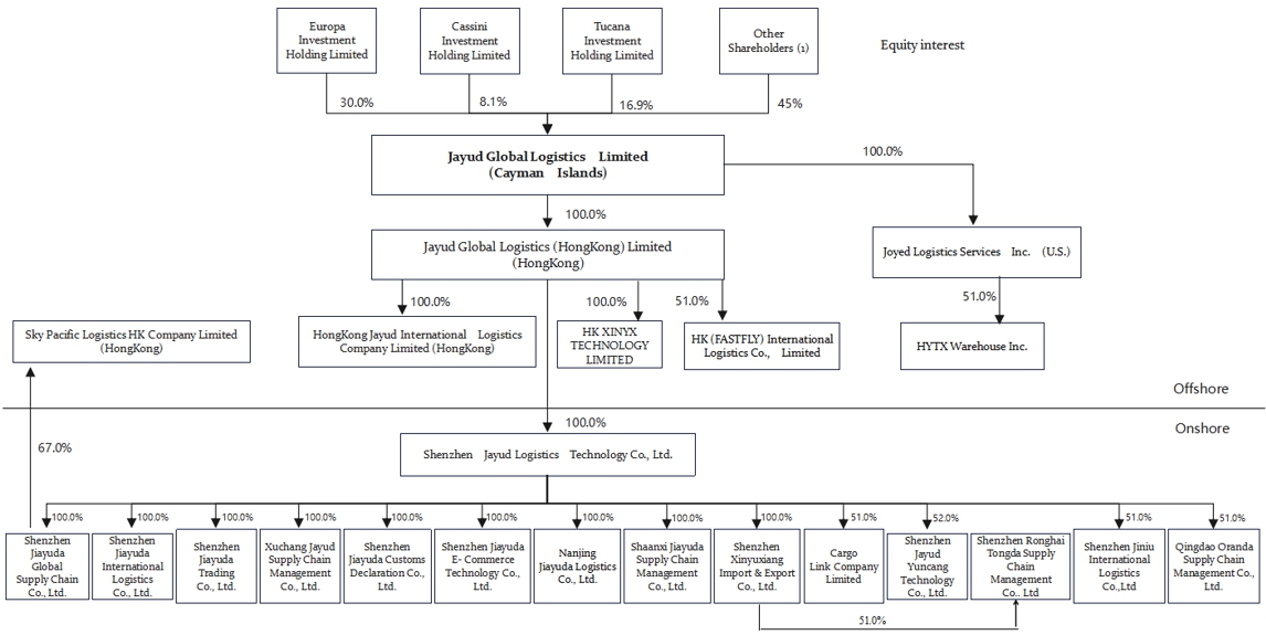 We are a Cayman Islands holding company and primarily conduct our operations in China through our PRC subsidiaries. We commenced our commercial operations in September 2009 through Shenzhen Jiayuda Trading Co., Ltd. In July 2015, Shenzhen Jayud Logistics Technology Co., Ltd. (previously under the name of Shenzhen Xinyuxiang Supply Chain Co., Ltd.) was established to optimize our resource allocation to further expand our business. On June 10, 2022, we incorporated Jayud Global Logistics Limited under the laws of the Cayman Islands as our offshore holding company to facilitate offshore financing. In June 2022, we established Jayud Global Logistics (Hong Kong) Limited, our wholly owned Hong Kong subsidiary.