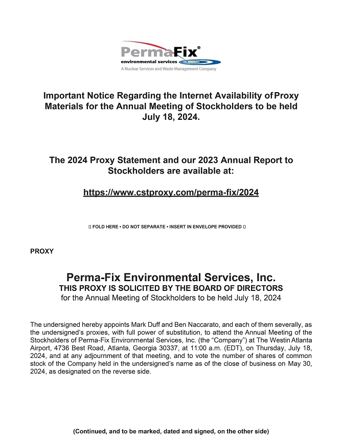 Notice is hereby given that the 2024 Annual Meeting of Stockholders (the “Meeting”) of Perma-Fix Environmental Services, Inc. (“Company”, “we”, “our”, or “us”) will be held at The Westin Atlanta Airport, 4736 Best Road, Atlanta, Georgia 30337, on Thursday, July 18, 2024, at 11:00 a.m. (EDT), for the following purposes: