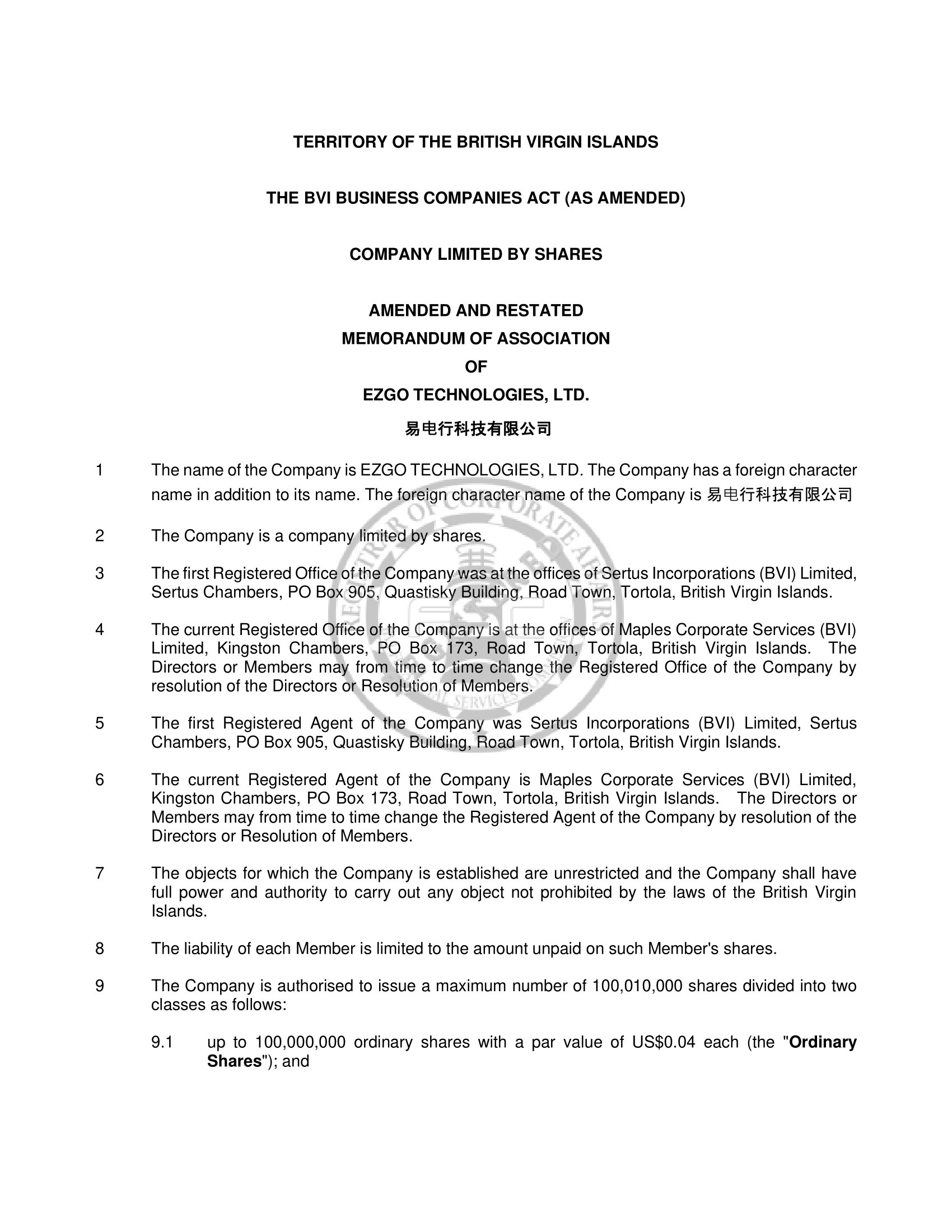 EZGO Technologies Ltd., a British Virgin Islands business company (the “Company”) is furnishing this Current Report on Form 6-K to report the amendment of Clause 9 of its amended and restated memorandum and articles of association to change the maximum number of shares that the Company is authorized to issue from 12,510,000 shares divided into up to 12,500,000 ordinary shares with a par value of US $0.04 each and up to 10,000 preferred shares of no par value each to 100,010,000 shares divided into up to 100,000,000 ordinary shares with a par value of US $0.04 each and up to 10,000 preferred shares of no par value each.