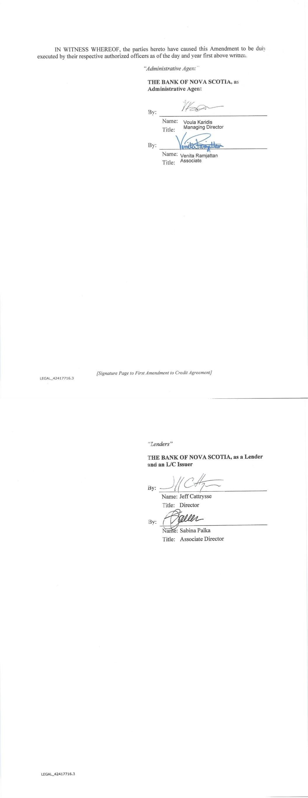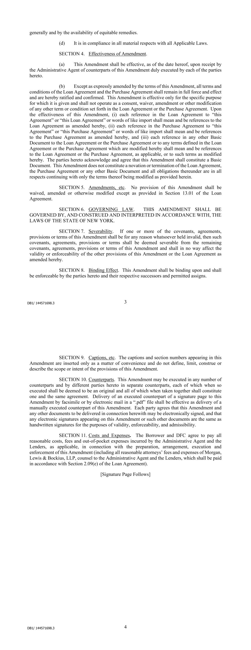 DB1/ 144772864.2 - 3 - validity or enforceability of the other provisions of this Amendment or the Loan Agreement as amended hereby. SECTION 7. Binding Effect. This Amendment shall be binding upon and shall be enforceable by the parties hereto and their respective successors and permitted assigns. SECTION 8. Captions, etc. The captions and section numbers appearing in this Amendment are inserted only as a matter of convenience and do not define, limit, construe or describe the scope or intent of the provisions of this Amendment. SECTION 9. Counterparts. This Amendment may be executed in any number of counterparts and by different parties hereto in separate counterparts, each of which when so executed shall be deemed to be an original and all of which when taken together shall constitute one and the same agreement. Delivery of an executed counterpart of a signature page to this Amendment by facsimile or by electronic mail in a “.pdf” file shall be effective as delivery of a manually executed counterpart of this Amendment. Each party agrees that this Amendment and any other documents to be delivered in connection herewith may be electronically signed, and that any electronic signatures appearing on this Amendment or such other documents are the same as handwritten signatures for the purposes of validity, enforceability, and admissibility. SECTION 10. Costs and Expenses. The Borrower and DFC agree to pay all reasonable costs, fees and out-of-pocket expenses incurred by the Administrative Agent and the Lenders, as applicable, in connection with the preparation, arrangement, execution and enforcement of this Amendment (including all reasonable attorneys’ fees and expenses of Morgan, Lewis & Bockius, LLP, counsel to the Administrative Agent and the Lenders, which shall be paid in accordance with Section 2.09(e) of the Loan Agreement). [Signature Page Follows]