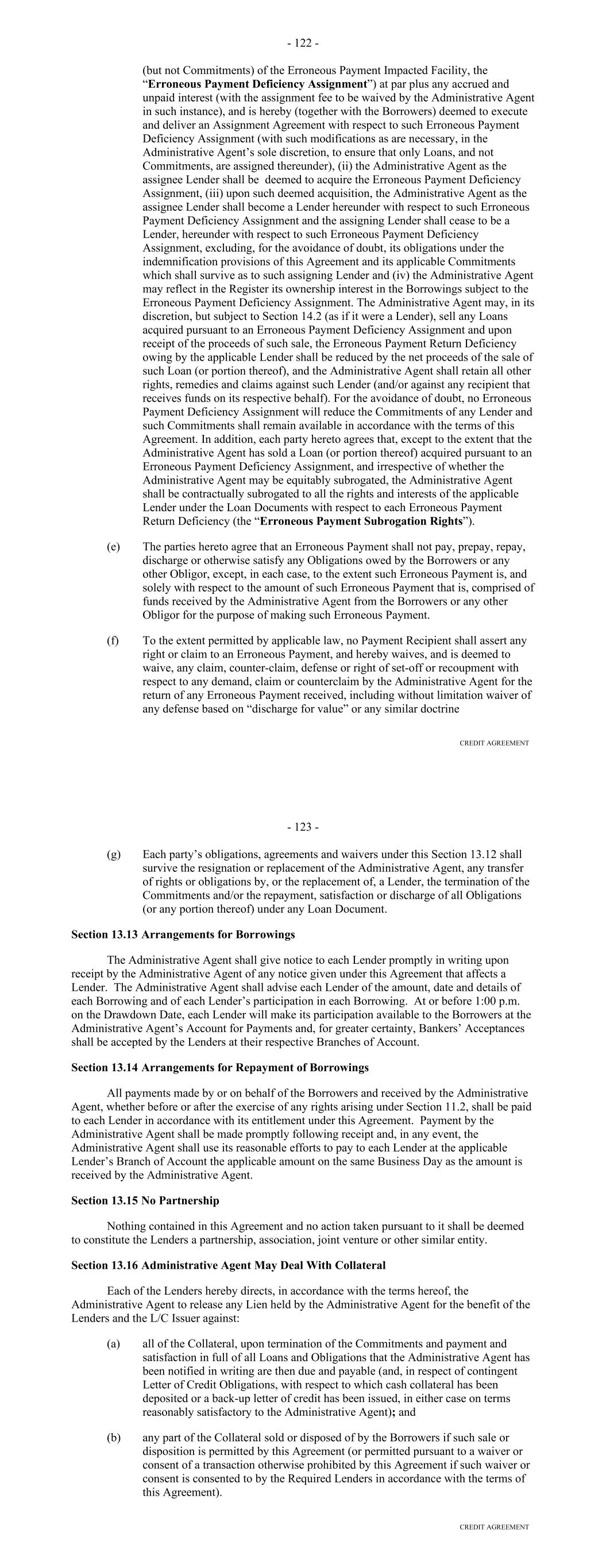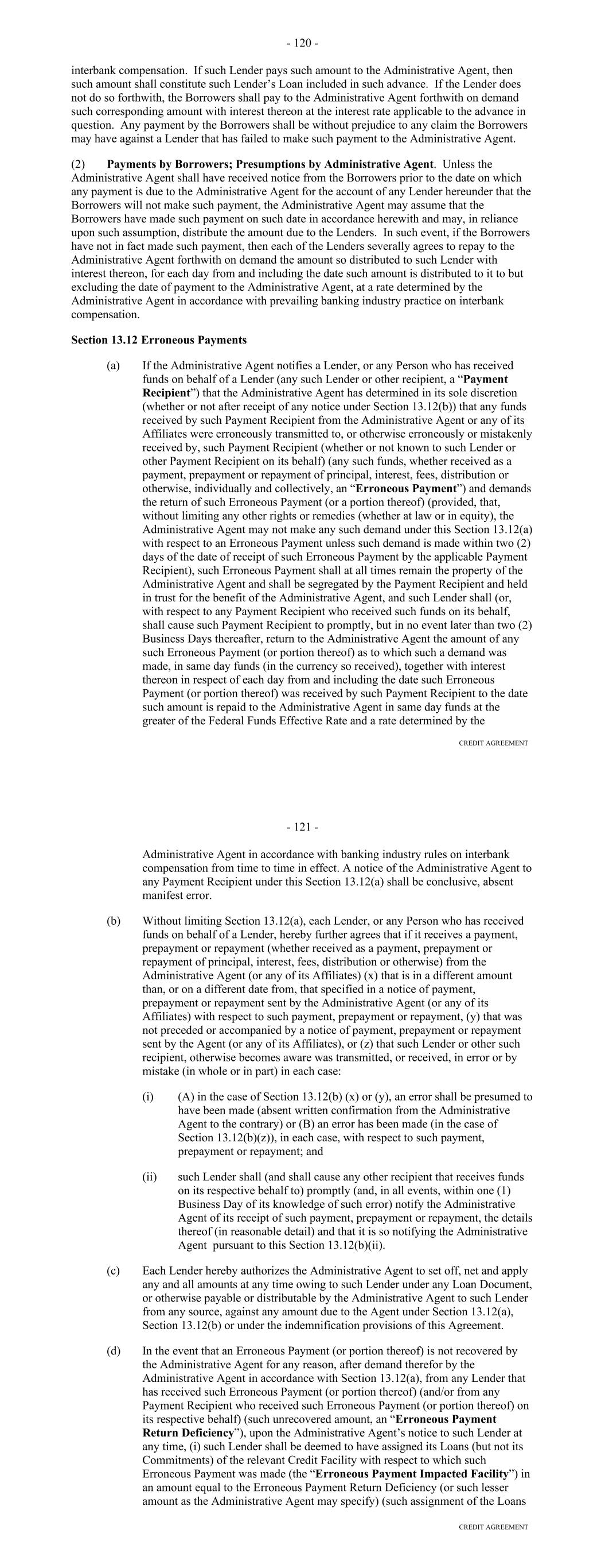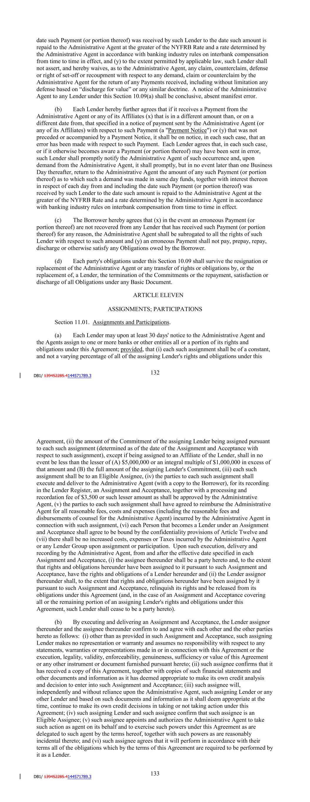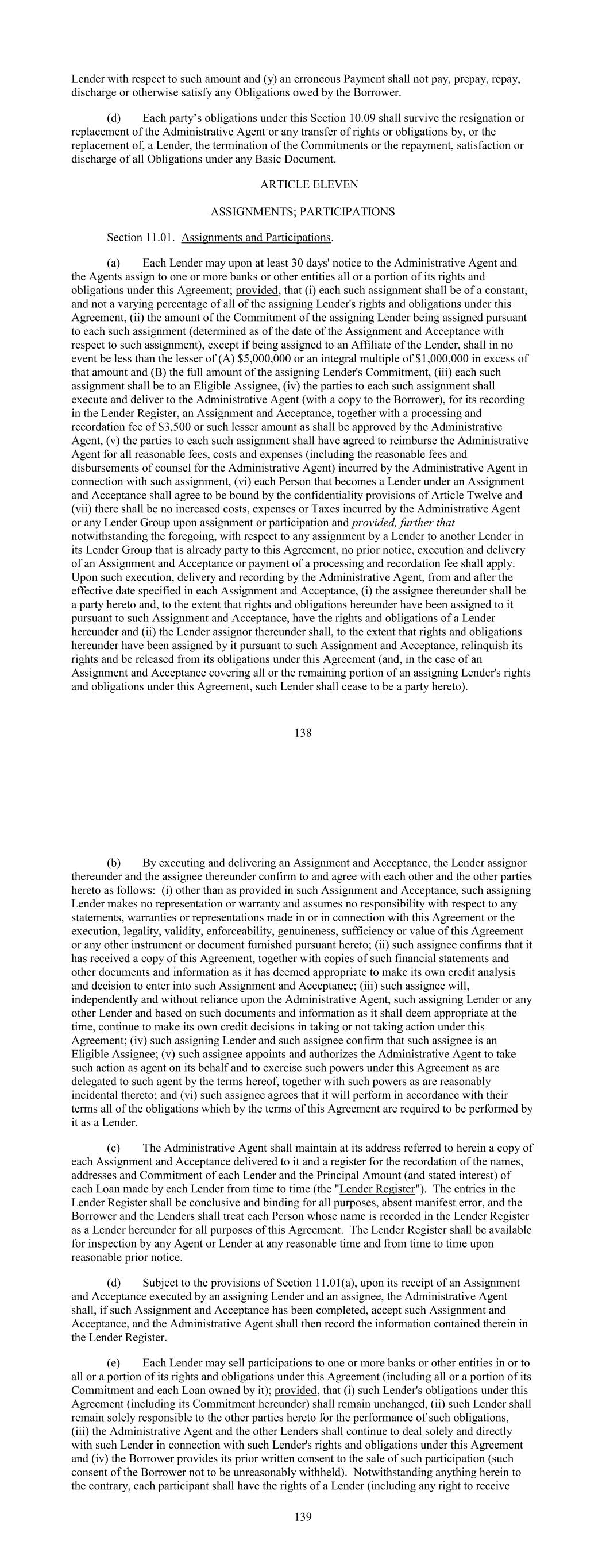 Lender with respect to such amount and (y) an erroneous Payment shall not pay, prepay, repay, discharge or otherwise satisfy any Obligations owed by the Borrower. (d) Each party’s obligations under this Section 10.09 shall survive the resignation or replacement of the Administrative Agent or any transfer of rights or obligations by, or the replacement of, a Lender, the termination of the Commitments or the repayment, satisfaction or discharge of all Obligations under any Basic Document. ARTICLE ELEVEN ASSIGNMENTS; PARTICIPATIONS Section 11.01. Assignments and Participations. (a) Each Lender may upon at least 30 days' notice to the Administrative Agent and the Agents assign to one or more banks or other entities all or a portion of its rights and obligations under this Agreement; provided, that (i) each such assignment shall be of a constant, and not a varying percentage of all of the assigning Lender's rights and obligations under this Agreement, (ii) the amount of the Commitment of the assigning Lender being assigned pursuant to each such assignment (determined as of the date of the Assignment and Acceptance with respect to such assignment), except if being assigned to an Affiliate of the Lender, shall in no event be less than the lesser of (A) $5,000,000 or an integral multiple of $1,000,000 in excess of that amount and (B) the full amount of the assigning Lender's Commitment, (iii) each such assignment shall be to an Eligible Assignee, (iv) the parties to each such assignment shall execute and deliver to the Administrative Agent (with a copy to the Borrower), for its recording in the Lender Register, an Assignment and Acceptance, together with a processing and recordation fee of $3,500 or such lesser amount as shall be approved by the Administrative Agent, (v) the parties to each such assignment shall have agreed to reimburse the Administrative Agent for all reasonable fees, costs and expenses (including the reasonable fees and disbursements of counsel for the Administrative Agent) incurred by the Administrative Agent in connection with such assignment, (vi) each Person that becomes a Lender under an Assignment and Acceptance shall agree to be bound by the confidentiality provisions of Article Twelve and (vii) there shall be no increased costs, expenses or Taxes incurred by the Administrative Agent or any Lender Group upon assignment or participation and provided, further that notwithstanding the foregoing, with respect to any assignment by a Lender to another Lender in its Lender Group that is already party to this Agreement, no prior notice, execution and delivery of an Assignment and Acceptance or payment of a processing and recordation fee shall apply. Upon such execution, delivery and recording by the Administrative Agent, from and after the effective date specified in each Assignment and Acceptance, (i) the assignee thereunder shall be a party hereto and, to the extent that rights and obligations hereunder have been assigned to it pursuant to such Assignment and Acceptance, have the rights and obligations of a Lender hereunder and (ii) the Lender assignor thereunder shall, to the extent that rights and obligations hereunder have been assigned by it pursuant to such Assignment and Acceptance, relinquish its rights and be released from its obligations under this Agreement (and, in the case of an Assignment and Acceptance covering all or the remaining portion of an assigning Lender's rights and obligations under this Agreement, such Lender shall cease to be a party hereto). 138 (b) By executing and delivering an Assignment and Acceptance, the Lender assignor thereunder and the assignee thereunder confirm to and agree with each other and the other parties hereto as follows: (i) other than as provided in such Assignment and Acceptance, such assigning Lender makes no representation or warranty and assumes no responsibility with respect to any statements, warranties or representations made in or in connection with this Agreement or the execution, legality, validity, enforceability, genuineness, sufficiency or value of this Agreement or any other instrument or document furnished pursuant hereto; (ii) such assignee confirms that it has received a copy of this Agreement, together with copies of such financial statements and other documents and information as it has deemed appropriate to make its own credit analysis and decision to enter into such Assignment and Acceptance; (iii) such assignee will, independently and without reliance upon the Administrative Agent, such assigning Lender or any other Lender and based on such documents and information as it shall deem appropriate at the time, continue to make its own credit decisions in taking or not taking action under this Agreement; (iv) such assigning Lender and such assignee confirm that such assignee is an Eligible Assignee; (v) such assignee appoints and authorizes the Administrative Agent to take such action as agent on its behalf and to exercise such powers under this Agreement as are delegated to such agent by the terms hereof, together with such powers as are reasonably incidental thereto; and (vi) such assignee agrees that it will perform in accordance with their terms all of the obligations which by the terms of this Agreement are required to be performed by it as a Lender. (c) The Administrative Agent shall maintain at its address referred to herein a copy of each Assignment and Acceptance delivered to it and a register for the recordation of the names, addresses and Commitment of each Lender and the Principal Amount (and stated interest) of each Loan made by each Lender from time to time (the "Lender Register"). The entries in the Lender Register shall be conclusive and binding for all purposes, absent manifest error, and the Borrower and the Lenders shall treat each Person whose name is recorded in the Lender Register as a Lender hereunder for all purposes of this Agreement. The Lender Register shall be available for inspect
