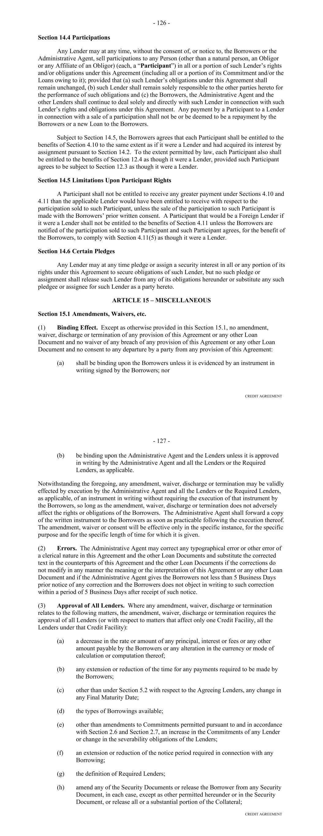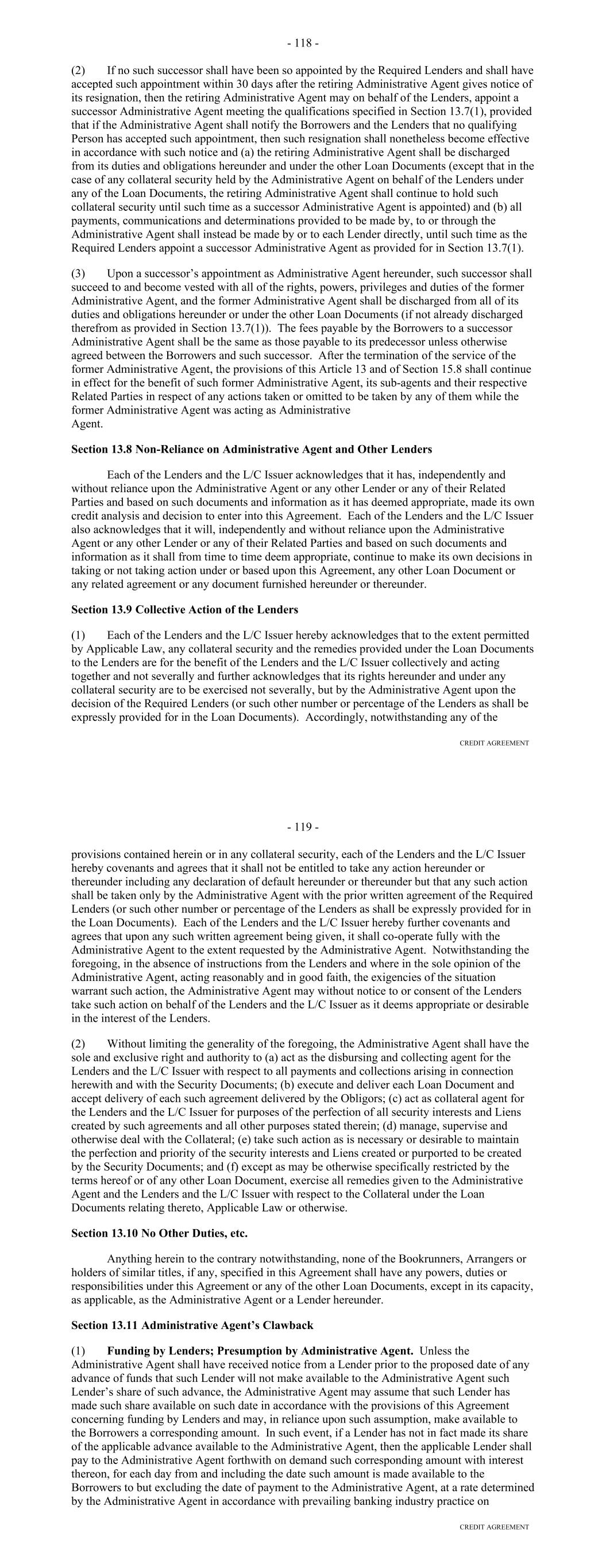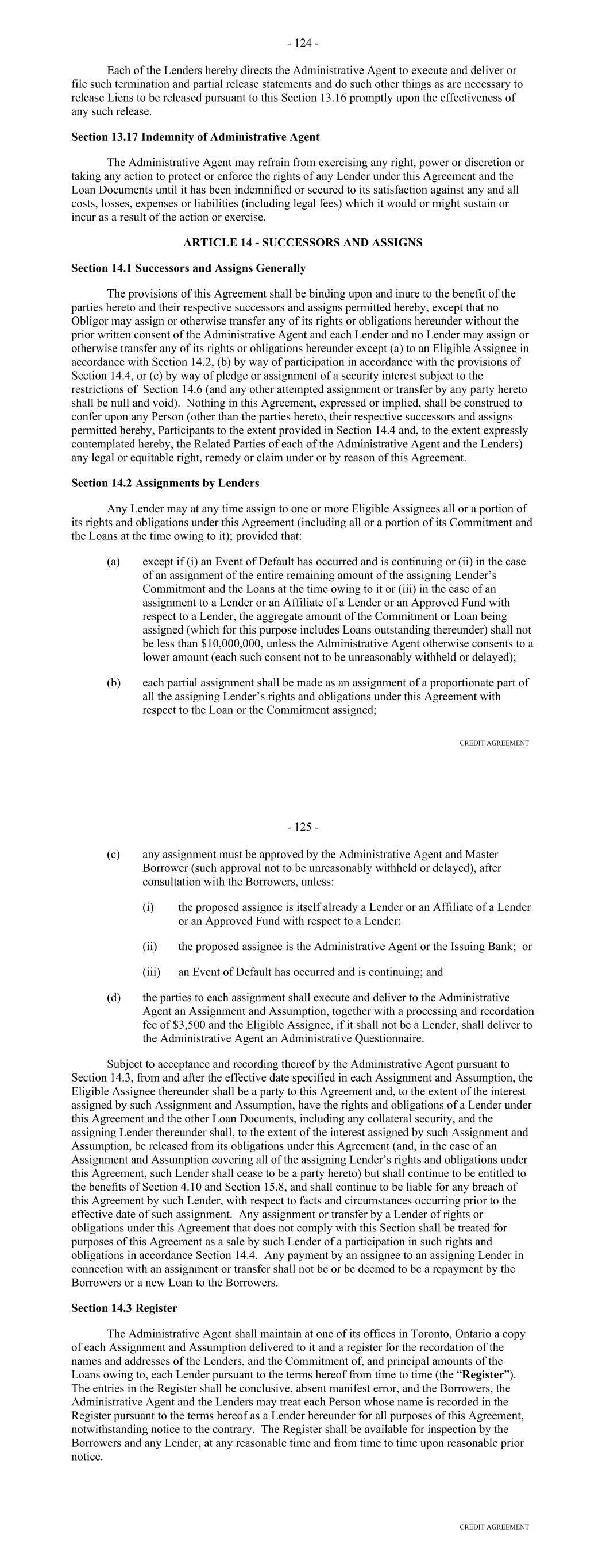Lender with respect to such amount and (y) an erroneous Payment shall not pay, prepay, repay, discharge or otherwise satisfy any Obligations owed by the Borrower. (d) Each party’s obligations under this Section 10.09 shall survive the resignation or replacement of the Administrative Agent or any transfer of rights or obligations by, or the replacement of, a Lender, the termination of the Commitments or the repayment, satisfaction or discharge of all Obligations under any Basic Document. ARTICLE ELEVEN ASSIGNMENTS; PARTICIPATIONS Section 11.01. Assignments and Participations. (a) Each Lender may upon at least 30 days' notice to the Administrative Agent and the Agents assign to one or more banks or other entities all or a portion of its rights and obligations under this Agreement; provided, that (i) each such assignment shall be of a constant, and not a varying percentage of all of the assigning Lender's rights and obligations under this Agreement, (ii) the amount of the Commitment of the assigning Lender being assigned pursuant to each such assignment (determined as of the date of the Assignment and Acceptance with respect to such assignment), except if being assigned to an Affiliate of the Lender, shall in no event be less than the lesser of (A) $5,000,000 or an integral multiple of $1,000,000 in excess of that amount and (B) the full amount of the assigning Lender's Commitment, (iii) each such assignment shall be to an Eligible Assignee, (iv) the parties to each such assignment shall execute and deliver to the Administrative Agent (with a copy to the Borrower), for its recording in the Lender Register, an Assignment and Acceptance, together with a processing and recordation fee of $3,500 or such lesser amount as shall be approved by the Administrative Agent, (v) the parties to each such assignment shall have agreed to reimburse the Administrative Agent for all reasonable fees, costs and expenses (including the reasonable fees and disbursements of counsel for the Administrative Agent) incurred by the Administrative Agent in connection with such assignment, (vi) each Person that becomes a Lender under an Assignment and Acceptance shall agree to be bound by the confidentiality provisions of Article Twelve and (vii) there shall be no increased costs, expenses or Taxes incurred by the Administrative Agent or any Lender Group upon assignment or participation and provided, further that notwithstanding the foregoing, with respect to any assignment by a Lender to another Lender in its Lender Group that is already party to this Agreement, no prior notice, execution and delivery of an Assignment and Acceptance or payment of a processing and recordation fee shall apply. Upon such execution, delivery and recording by the Administrative Agent, from and after the effective date specified in each Assignment and Acceptance, (i) the assignee thereunder shall be a party hereto and, to the extent that rights and obligations hereunder have been assigned to it pursuant to such Assignment and Acceptance, have the rights and obligations of a Lender hereunder and (ii) the Lender assignor thereunder shall, to the extent that rights and obligations hereunder have been assigned by it pursuant to such Assignment and Acceptance, relinquish its rights and be released from its obligations under this Agreement (and, in the case of an Assignment and Acceptance covering all or the remaining portion of an assigning Lender's rights and obligations under this Agreement, such Lender shall cease to be a party hereto). 138 (b) By executing and delivering an Assignment and Acceptance, the Lender assignor thereunder and the assignee thereunder confirm to and agree with each other and the other parties hereto as follows: (i) other than as provided in such Assignment and Acceptance, such assigning Lender makes no representation or warranty and assumes no responsibility with respect to any statements, warranties or representations made in or in connection with this Agreement or the execution, legality, validity, enforceability, genuineness, sufficiency or value of this Agreement or any other instrument or document furnished pursuant hereto; (ii) such assignee confirms that it has received a copy of this Agreement, together with copies of such financial statements and other documents and information as it has deemed appropriate to make its own credit analysis and decision to enter into such Assignment and Acceptance; (iii) such assignee will, independently and without reliance upon the Administrative Agent, such assigning Lender or any other Lender and based on such documents and information as it shall deem appropriate at the time, continue to make its own credit decisions in taking or not taking action under this Agreement; (iv) such assigning Lender and such assignee confirm that such assignee is an Eligible Assignee; (v) such assignee appoints and authorizes the Administrative Agent to take such action as agent on its behalf and to exercise such powers under this Agreement as are delegated to such agent by the terms hereof, together with such powers as are reasonably incidental thereto; and (vi) such assignee agrees that it will perform in accordance with their terms all of the obligations which by the terms of this Agreement are required to be performed by it as a Lender. (c) The Administrative Agent shall maintain at its address referred to herein a copy of each Assignment and Acceptance delivered to it and a register for the recordation of the names, addresses and Commitment of each Lender and the Principal Amount (and stated interest) of each Loan made by each Lender from time to time (the "Lender Register"). The entries in the Lender Register shall be conclusive and binding for all purposes, absent manifest error, and the Borrower and the Lenders shall treat each Person whose name is recorded in the Lender Register as a Lender hereunder for all purposes of this Agreement. The Lender Register shall be available for inspect