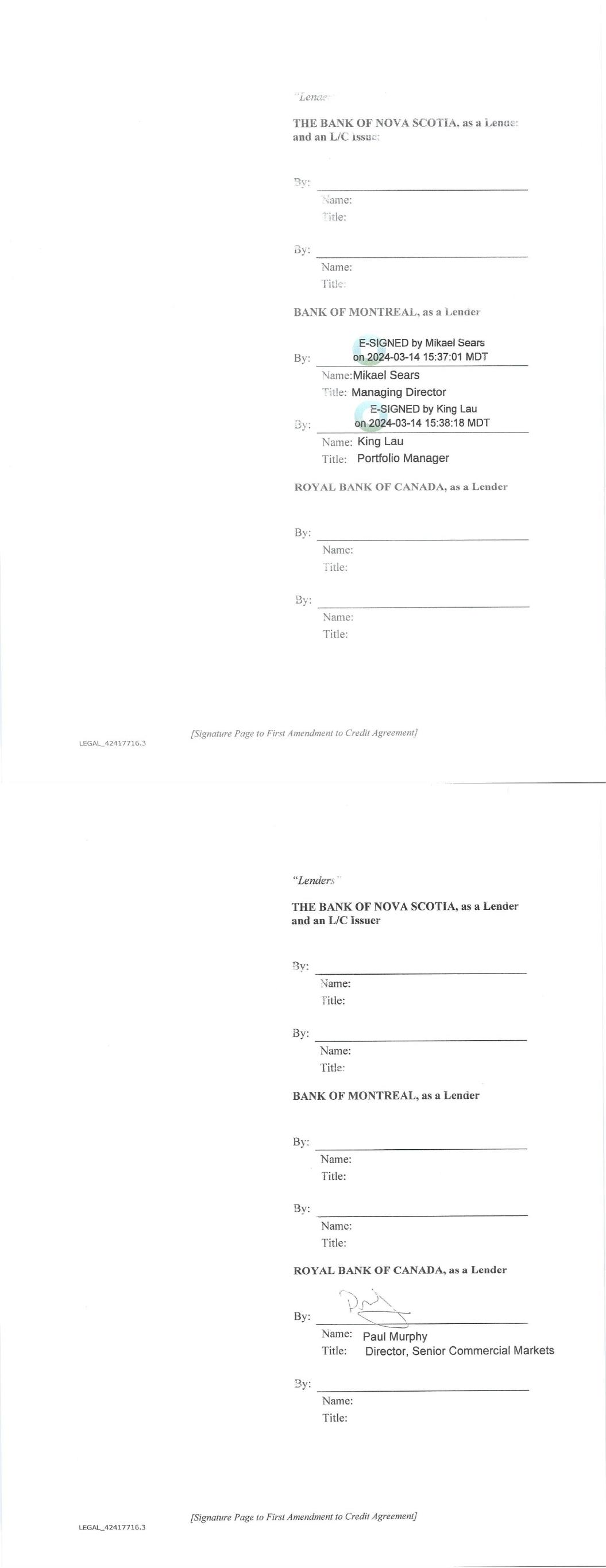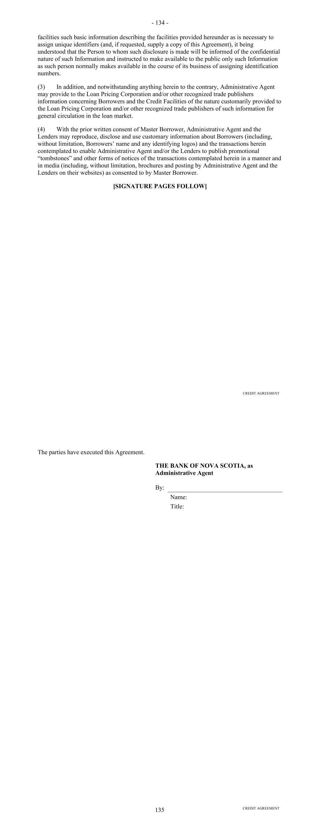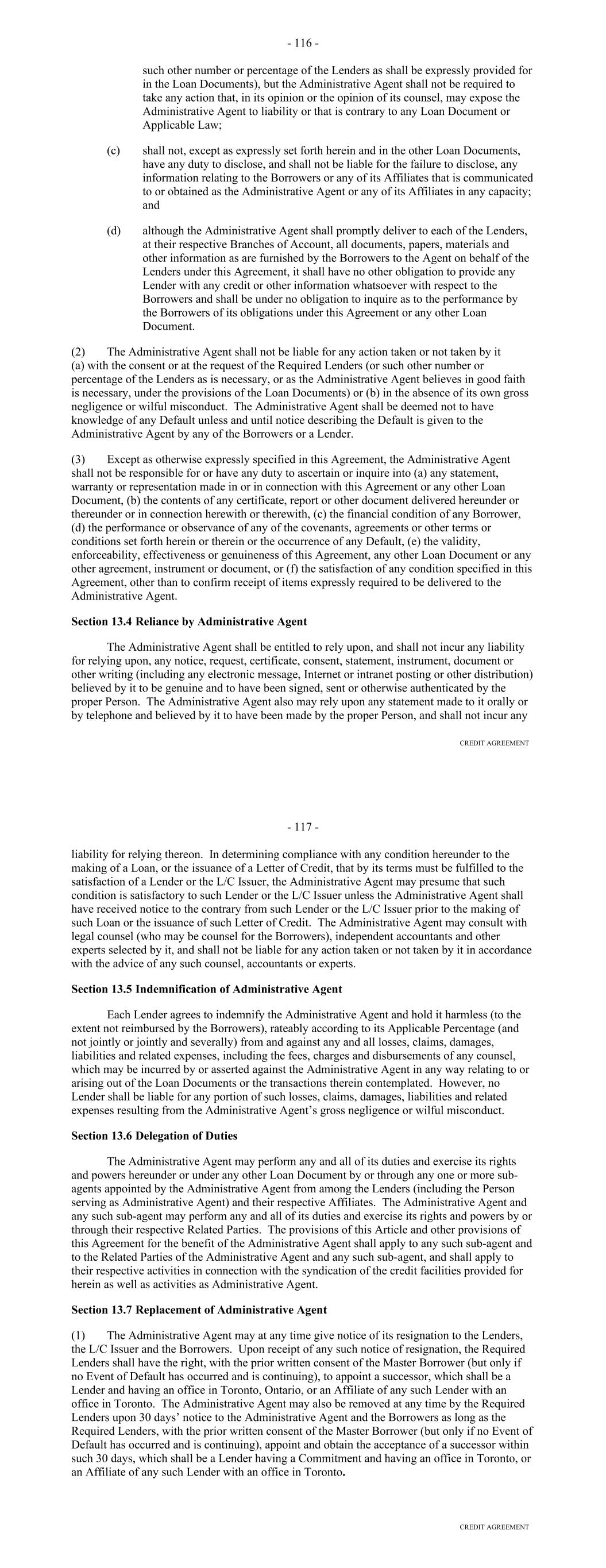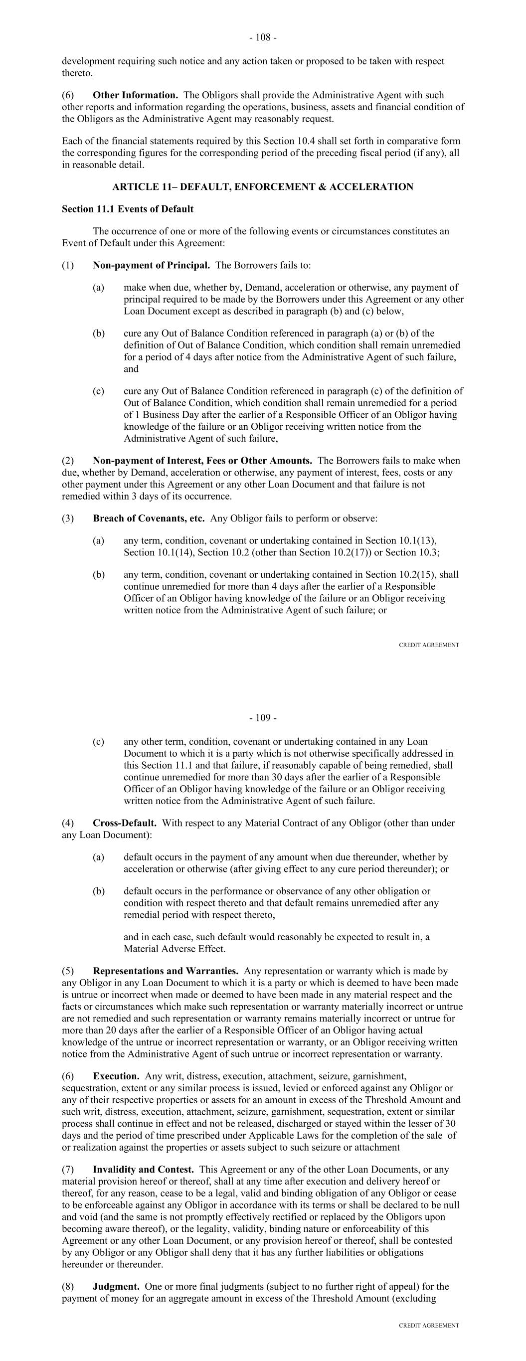 Lender with respect to such amount and (y) an erroneous Payment shall not pay, prepay, repay, discharge or otherwise satisfy any Obligations owed by the Borrower. (d) Each party’s obligations under this Section 10.09 shall survive the resignation or replacement of the Administrative Agent or any transfer of rights or obligations by, or the replacement of, a Lender, the termination of the Commitments or the repayment, satisfaction or discharge of all Obligations under any Basic Document. ARTICLE ELEVEN ASSIGNMENTS; PARTICIPATIONS Section 11.01. Assignments and Participations. (a) Each Lender may upon at least 30 days' notice to the Administrative Agent and the Agents assign to one or more banks or other entities all or a portion of its rights and obligations under this Agreement; provided, that (i) each such assignment shall be of a constant, and not a varying percentage of all of the assigning Lender's rights and obligations under this Agreement, (ii) the amount of the Commitment of the assigning Lender being assigned pursuant to each such assignment (determined as of the date of the Assignment and Acceptance with respect to such assignment), except if being assigned to an Affiliate of the Lender, shall in no event be less than the lesser of (A) $5,000,000 or an integral multiple of $1,000,000 in excess of that amount and (B) the full amount of the assigning Lender's Commitment, (iii) each such assignment shall be to an Eligible Assignee, (iv) the parties to each such assignment shall execute and deliver to the Administrative Agent (with a copy to the Borrower), for its recording in the Lender Register, an Assignment and Acceptance, together with a processing and recordation fee of $3,500 or such lesser amount as shall be approved by the Administrative Agent, (v) the parties to each such assignment shall have agreed to reimburse the Administrative Agent for all reasonable fees, costs and expenses (including the reasonable fees and disbursements of counsel for the Administrative Agent) incurred by the Administrative Agent in connection with such assignment, (vi) each Person that becomes a Lender under an Assignment and Acceptance shall agree to be bound by the confidentiality provisions of Article Twelve and (vii) there shall be no increased costs, expenses or Taxes incurred by the Administrative Agent or any Lender Group upon assignment or participation and provided, further that notwithstanding the foregoing, with respect to any assignment by a Lender to another Lender in its Lender Group that is already party to this Agreement, no prior notice, execution and delivery of an Assignment and Acceptance or payment of a processing and recordation fee shall apply. Upon such execution, delivery and recording by the Administrative Agent, from and after the effective date specified in each Assignment and Acceptance, (i) the assignee thereunder shall be a party hereto and, to the extent that rights and obligations hereunder have been assigned to it pursuant to such Assignment and Acceptance, have the rights and obligations of a Lender hereunder and (ii) the Lender assignor thereunder shall, to the extent that rights and obligations hereunder have been assigned by it pursuant to such Assignment and Acceptance, relinquish its rights and be released from its obligations under this Agreement (and, in the case of an Assignment and Acceptance covering all or the remaining portion of an assigning Lender's rights and obligations under this Agreement, such Lender shall cease to be a party hereto). 138 (b) By executing and delivering an Assignment and Acceptance, the Lender assignor thereunder and the assignee thereunder confirm to and agree with each other and the other parties hereto as follows: (i) other than as provided in such Assignment and Acceptance, such assigning Lender makes no representation or warranty and assumes no responsibility with respect to any statements, warranties or representations made in or in connection with this Agreement or the execution, legality, validity, enforceability, genuineness, sufficiency or value of this Agreement or any other instrument or document furnished pursuant hereto; (ii) such assignee confirms that it has received a copy of this Agreement, together with copies of such financial statements and other documents and information as it has deemed appropriate to make its own credit analysis and decision to enter into such Assignment and Acceptance; (iii) such assignee will, independently and without reliance upon the Administrative Agent, such assigning Lender or any other Lender and based on such documents and information as it shall deem appropriate at the time, continue to make its own credit decisions in taking or not taking action under this Agreement; (iv) such assigning Lender and such assignee confirm that such assignee is an Eligible Assignee; (v) such assignee appoints and authorizes the Administrative Agent to take such action as agent on its behalf and to exercise such powers under this Agreement as are delegated to such agent by the terms hereof, together with such powers as are reasonably incidental thereto; and (vi) such assignee agrees that it will perform in accordance with their terms all of the obligations which by the terms of this Agreement are required to be performed by it as a Lender. (c) The Administrative Agent shall maintain at its address referred to herein a copy of each Assignment and Acceptance delivered to it and a register for the recordation of the names, addresses and Commitment of each Lender and the Principal Amount (and stated interest) of each Loan made by each Lender from time to time (the "Lender Register"). The entries in the Lender Register shall be conclusive and binding for all purposes, absent manifest error, and the Borrower and the Lenders shall treat each Person whose name is recorded in the Lender Register as a Lender hereunder for all purposes of this Agreement. The Lender Register shall be available for inspect