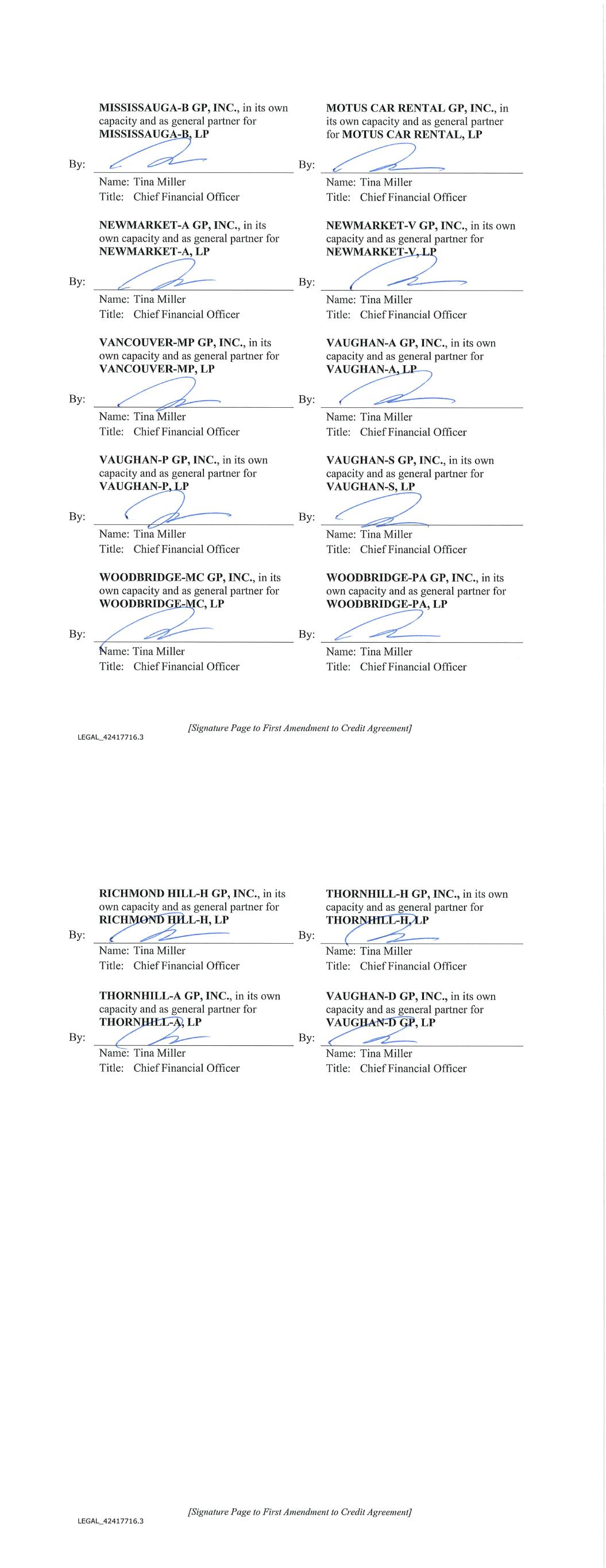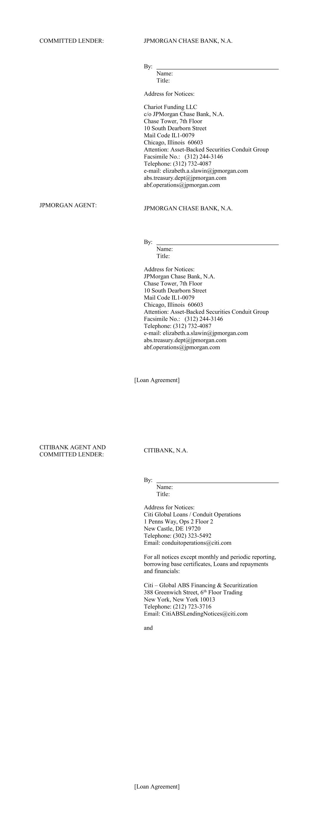 [Loan Agreement] COMMITTED LENDER: JPMORGAN CHASE BANK, N.A. By: Name: Title: Address for Notices: Chariot Funding LLC c/o JPMorgan Chase Bank, N.A. Chase Tower, 7th Floor 10 South Dearborn Street Mail Code IL1-0079 Chicago, Illinois 60603 Attention: Asset-Backed Securities Conduit Group Facsimile No.: (312) 244-3146 Telephone: (312) 732-4087 e-mail: elizabeth.a.slawin@jpmorgan.com abs.treasury.dept@jpmorgan.com abf.operations@jpmorgan.com JPMORGAN AGENT: JPMORGAN CHASE BANK, N.A. By: Name: Title: Address for Notices: JPMorgan Chase Bank, N.A. Chase Tower, 7th Floor 10 South Dearborn Street Mail Code IL1-0079 Chicago, Illinois 60603 Attention: Asset-Backed Securities Conduit Group Facsimile No.: (312) 244-3146 Telephone: (312) 732-4087 e-mail: elizabeth.a.slawin@jpmorgan.com abs.treasury.dept@jpmorgan.com abf.operations@jpmorgan.com [Loan Agreement] CITIBANK AGENT AND COMMITTED LENDER: By: Name: Title: Address for Notices: Citi Global Loans / Conduit Operations 1 Penns Way, Ops 2 Floor 2 New Castle, DE 19720 Telephone: (302) 323-5492 Email: conduitoperations@citi.com For all notices except monthly and periodic reporting, borrowing base certificates, Loans and repayments and financials: Citi – Global ABS Financing & Securitization 388 Greenwich Street, 6th Floor Trading New York, New York 10013 Telephone: (212) 723-3716 Email: CitiABSLendingNotices@citi.com and CITIBANK, N.A.