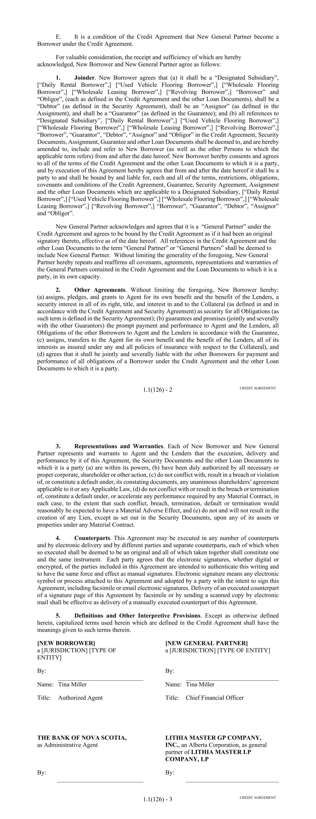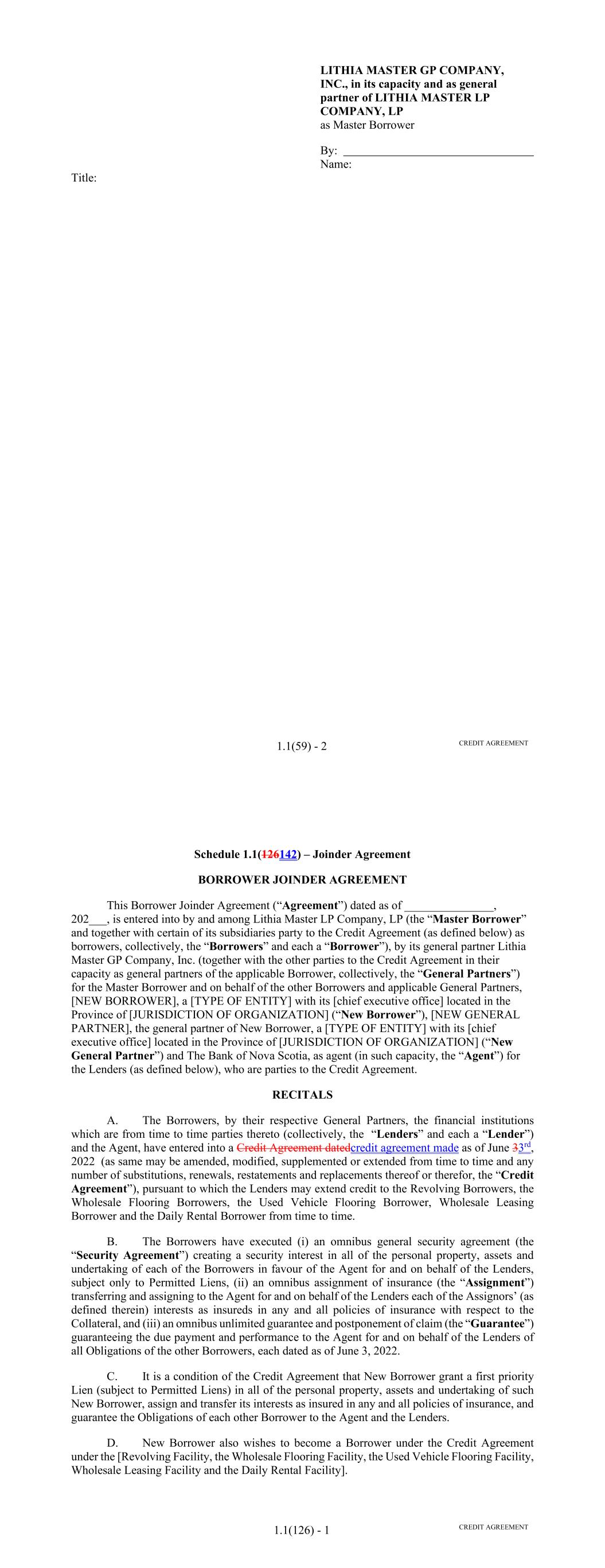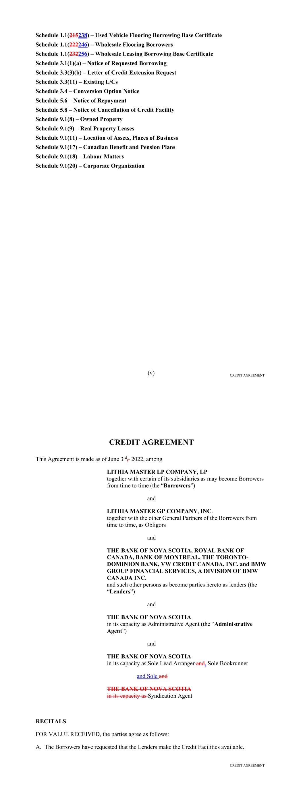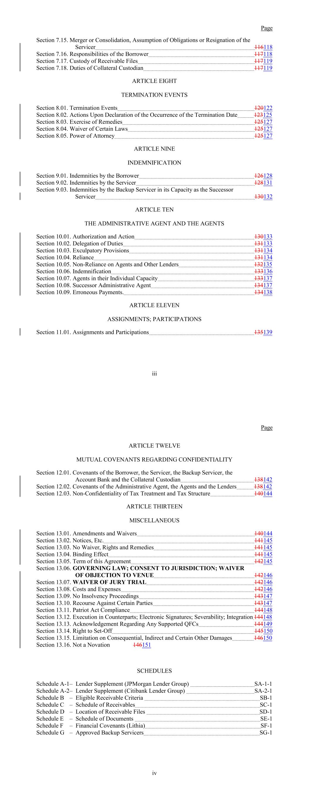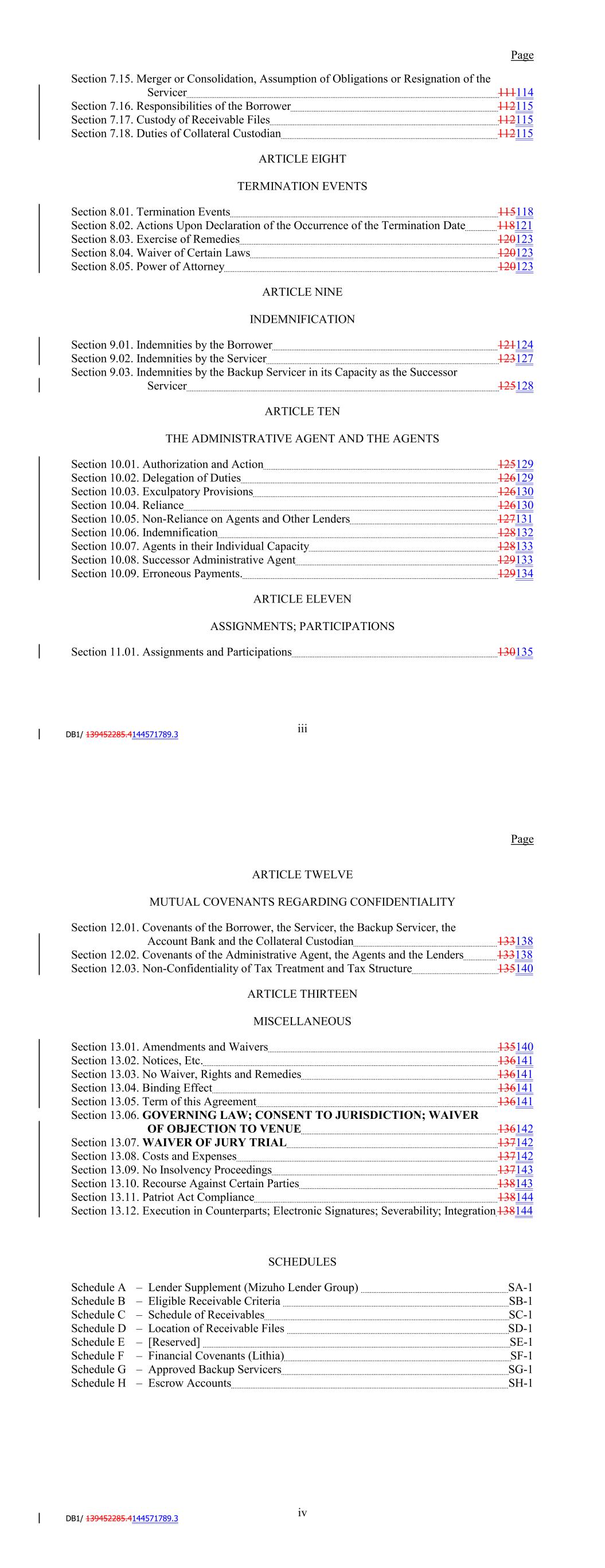 Page Section 7.15. Merger or Consolidation, Assumption of Obligations or Resignation of the Servicer 116118 Section 7.16. Responsibilities of the Borrower 117118 Section 7.17. Custody of Receivable Files 117119 Section 7.18. Duties of Collateral Custodian 117119 ARTICLE EIGHT TERMINATION EVENTS Section 8.01. Termination Events 120122 Section 8.02. Actions Upon Declaration of the Occurrence of the Termination Date 123125 Section 8.03. Exercise of Remedies 125127 Section 8.04. Waiver of Certain Laws 125127 Section 8.05. Power of Attorney 125127 ARTICLE NINE INDEMNIFICATION Section 9.01. Indemnities by the Borrower 126128 Section 9.02. Indemnities by the Servicer 128131 Section 9.03. Indemnities by the Backup Servicer in its Capacity as the Successor Servicer 130132 ARTICLE TEN THE ADMINISTRATIVE AGENT AND THE AGENTS Section 10.01. Authorization and Action 130133 Section 10.02. Delegation of Duties 131133 Section 10.03. Exculpatory Provisions 131134 Section 10.04. Reliance 131134 Section 10.05. Non-Reliance on Agents and Other Lenders 132135 Section 10.06. Indemnification 133136 Section 10.07. Agents in their Individual Capacity 133137 Section 10.08. Successor Administrative Agent 134137 Section 10.09. Erroneous Payments. 134138 ARTICLE ELEVEN ASSIGNMENTS; PARTICIPATIONS Section 11.01. Assignments and Participations 135139 iii Page ARTICLE TWELVE MUTUAL COVENANTS REGARDING CONFIDENTIALITY Section 12.01. Covenants of the Borrower, the Servicer, the Backup Servicer, the Account Bank and the Collateral Custodian 138142 Section 12.02. Covenants of the Administrative Agent, the Agents and the Lenders 138142 Section 12.03. Non-Confidentiality of Tax Treatment and Tax Structure 140144 ARTICLE THIRTEEN MISCELLANEOUS Section 13.01. Amendments and Waivers 140144 Section 13.02. Notices, Etc. 141145 Section 13.03. No Waiver, Rights and Remedies 141145 Section 13.04. Binding Effect 141145 Section 13.05. Term of this Agreement 142145 Section 13.06. GOVERNING LAW; CONSENT TO JURISDICTION; WAIVER OF OBJECTION TO VENUE 142146 Section 13.07. WAIVER OF JURY TRIAL 142146 Section 13.08. Costs and Expenses 142146 Section 13.09. No Insolvency Proceedings 143147 Section 13.10. Recourse Against Certain Parties 143147 Section 13.11. Patriot Act Compliance 144148 Section 13.12. Execution in Counterparts; Electronic Signatures; Severability; Integration 144148 Section 13.13. Acknowledgement Regarding Any Supported QFCs 144149 Section 13.14. Right to Set-Off 145150 Section 13.15. Limitation on Consequential, Indirect and Certain Other Damages 146150 Section 13.16. Not a Novation 146151 SCHEDULES Schedule A-1– Lender Supplement (JPMorgan Lender Group) SA-1-1 Schedule A-2– Lender Supplement (Citibank Lender Group) SA-2-1 Schedule B – Eligible Receivable Criteria SB-1 Schedule C – Schedule of Receivables SC-1 Schedule D – Location of Receivable Files SD-1 Schedule E – Schedule of Documents SE-1 Schedule F – Financial Covenants (Lithia) SF-1 Schedule G – Approved Backup Servicers SG-1 iv