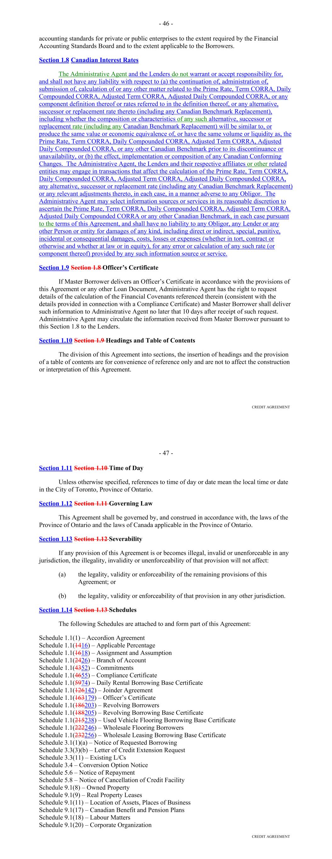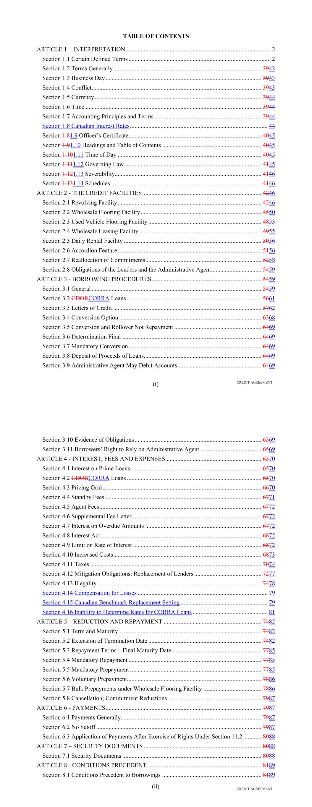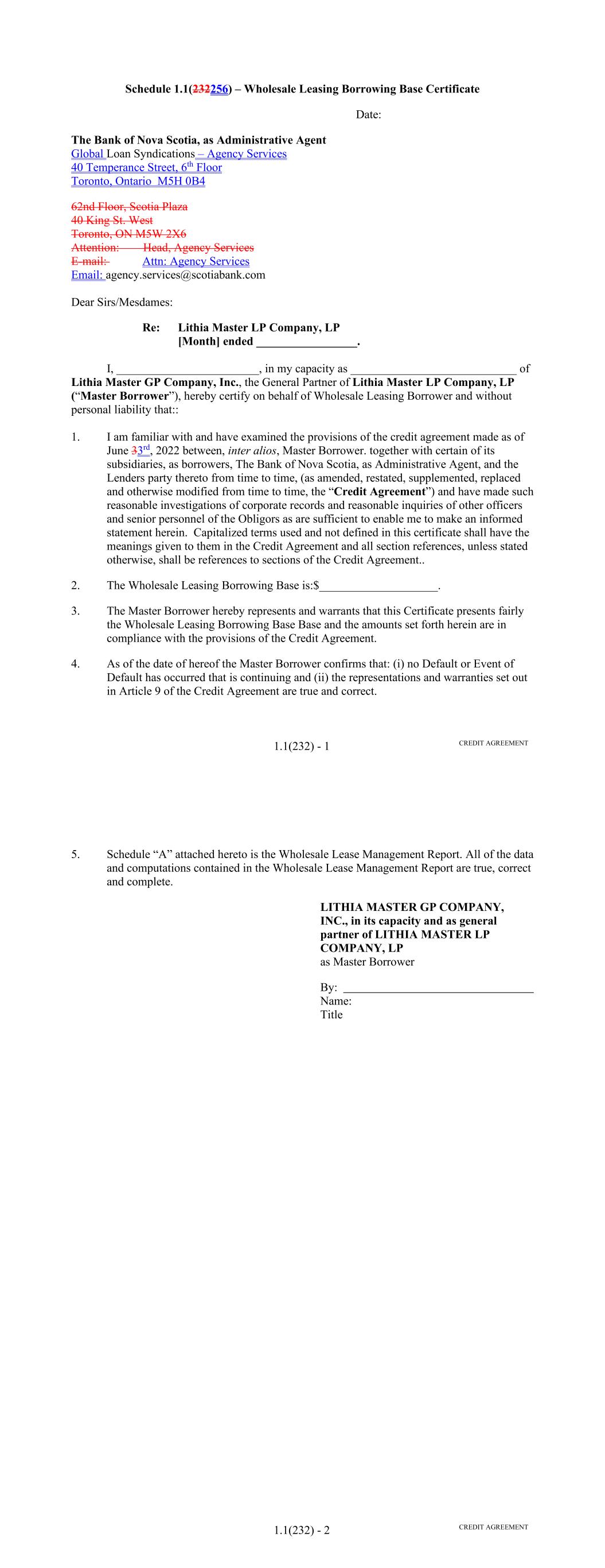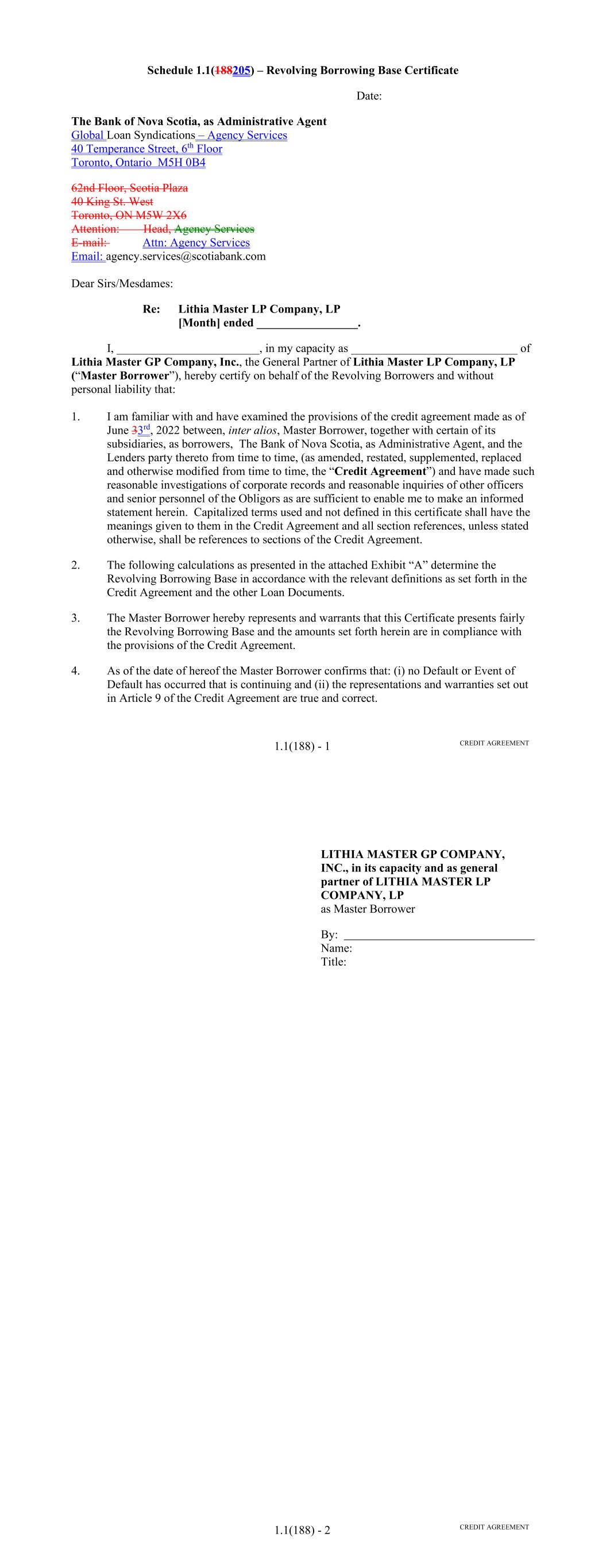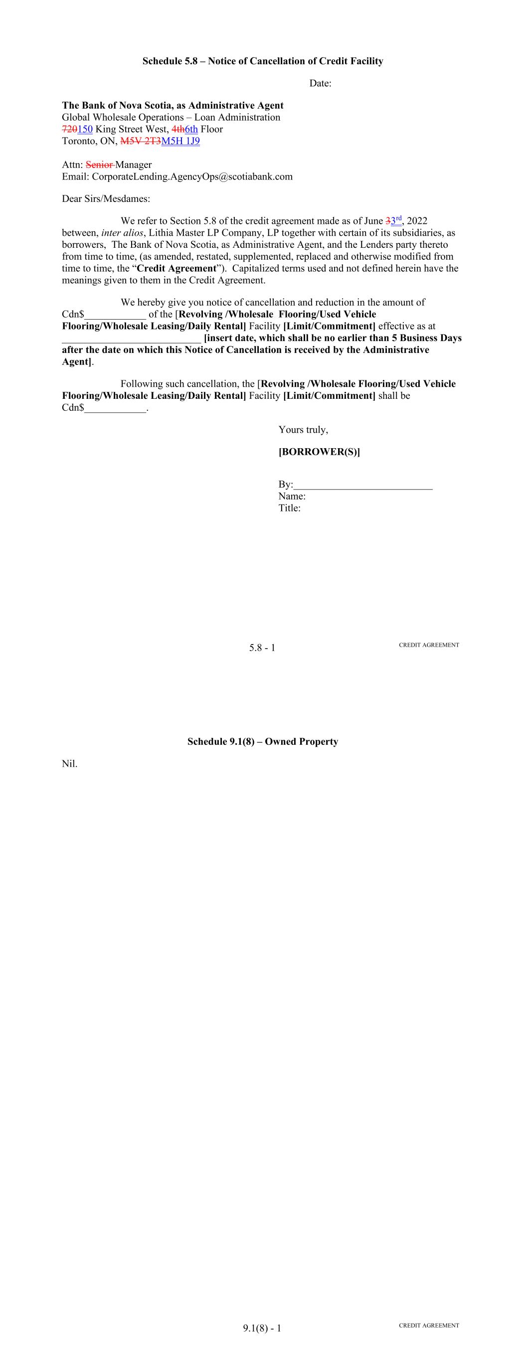 Page Section 7.15. Merger or Consolidation, Assumption of Obligations or Resignation of the Servicer 116118 Section 7.16. Responsibilities of the Borrower 117118 Section 7.17. Custody of Receivable Files 117119 Section 7.18. Duties of Collateral Custodian 117119 ARTICLE EIGHT TERMINATION EVENTS Section 8.01. Termination Events 120122 Section 8.02. Actions Upon Declaration of the Occurrence of the Termination Date 123125 Section 8.03. Exercise of Remedies 125127 Section 8.04. Waiver of Certain Laws 125127 Section 8.05. Power of Attorney 125127 ARTICLE NINE INDEMNIFICATION Section 9.01. Indemnities by the Borrower 126128 Section 9.02. Indemnities by the Servicer 128131 Section 9.03. Indemnities by the Backup Servicer in its Capacity as the Successor Servicer 130132 ARTICLE TEN THE ADMINISTRATIVE AGENT AND THE AGENTS Section 10.01. Authorization and Action 130133 Section 10.02. Delegation of Duties 131133 Section 10.03. Exculpatory Provisions 131134 Section 10.04. Reliance 131134 Section 10.05. Non-Reliance on Agents and Other Lenders 132135 Section 10.06. Indemnification 133136 Section 10.07. Agents in their Individual Capacity 133137 Section 10.08. Successor Administrative Agent 134137 Section 10.09. Erroneous Payments. 134138 ARTICLE ELEVEN ASSIGNMENTS; PARTICIPATIONS Section 11.01. Assignments and Participations 135139 iii Page ARTICLE TWELVE MUTUAL COVENANTS REGARDING CONFIDENTIALITY Section 12.01. Covenants of the Borrower, the Servicer, the Backup Servicer, the Account Bank and the Collateral Custodian 138142 Section 12.02. Covenants of the Administrative Agent, the Agents and the Lenders 138142 Section 12.03. Non-Confidentiality of Tax Treatment and Tax Structure 140144 ARTICLE THIRTEEN MISCELLANEOUS Section 13.01. Amendments and Waivers 140144 Section 13.02. Notices, Etc. 141145 Section 13.03. No Waiver, Rights and Remedies 141145 Section 13.04. Binding Effect 141145 Section 13.05. Term of this Agreement 142145 Section 13.06. GOVERNING LAW; CONSENT TO JURISDICTION; WAIVER OF OBJECTION TO VENUE 142146 Section 13.07. WAIVER OF JURY TRIAL 142146 Section 13.08. Costs and Expenses 142146 Section 13.09. No Insolvency Proceedings 143147 Section 13.10. Recourse Against Certain Parties 143147 Section 13.11. Patriot Act Compliance 144148 Section 13.12. Execution in Counterparts; Electronic Signatures; Severability; Integration 144148 Section 13.13. Acknowledgement Regarding Any Supported QFCs 144149 Section 13.14. Right to Set-Off 145150 Section 13.15. Limitation on Consequential, Indirect and Certain Other Damages 146150 Section 13.16. Not a Novation 146151 SCHEDULES Schedule A-1– Lender Supplement (JPMorgan Lender Group) SA-1-1 Schedule A-2– Lender Supplement (Citibank Lender Group) SA-2-1 Schedule B – Eligible Receivable Criteria SB-1 Schedule C – Schedule of Receivables SC-1 Schedule D – Location of Receivable Files SD-1 Schedule E – Schedule of Documents SE-1 Schedule F – Financial Covenants (Lithia) SF-1 Schedule G – Approved Backup Servicers SG-1 iv