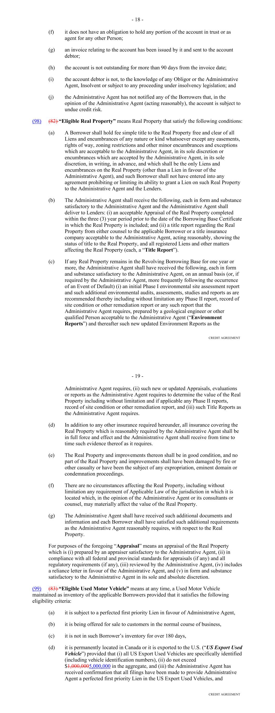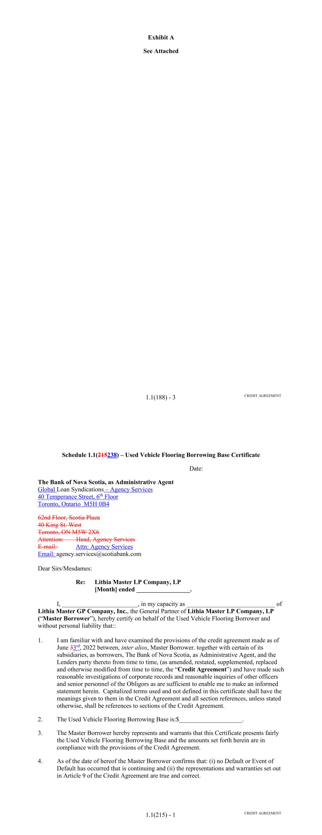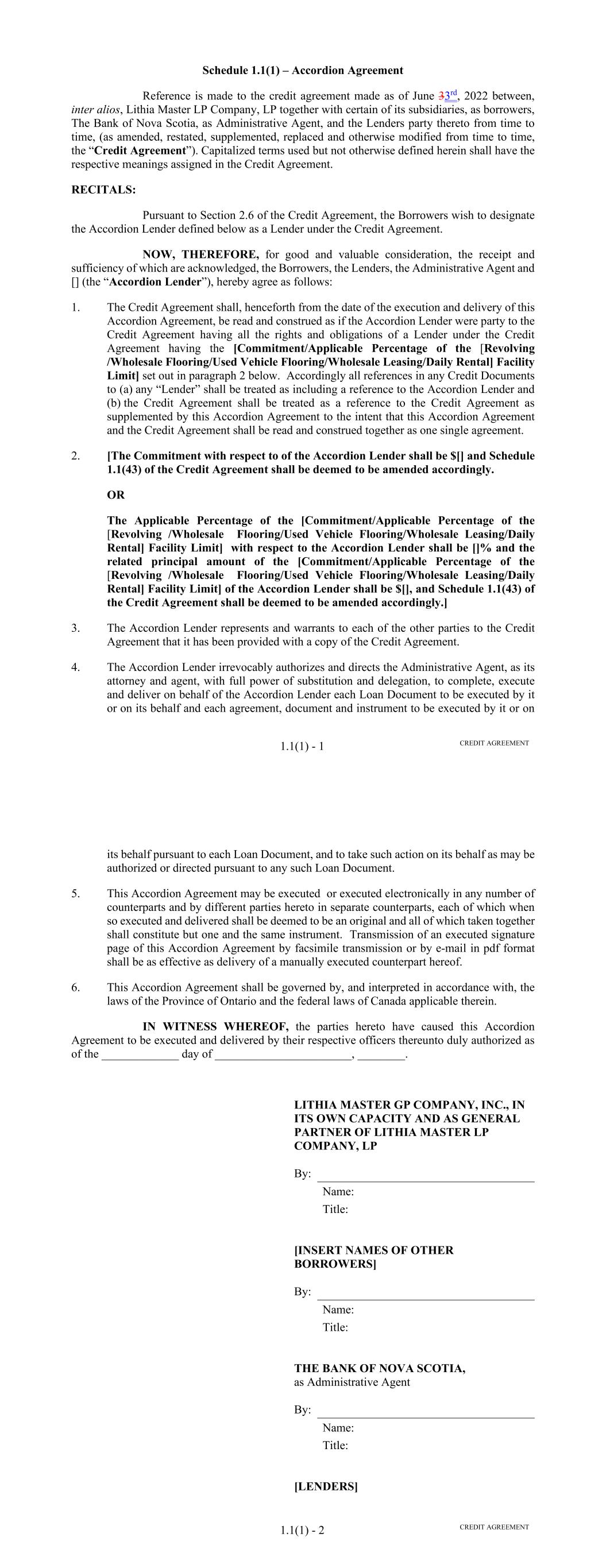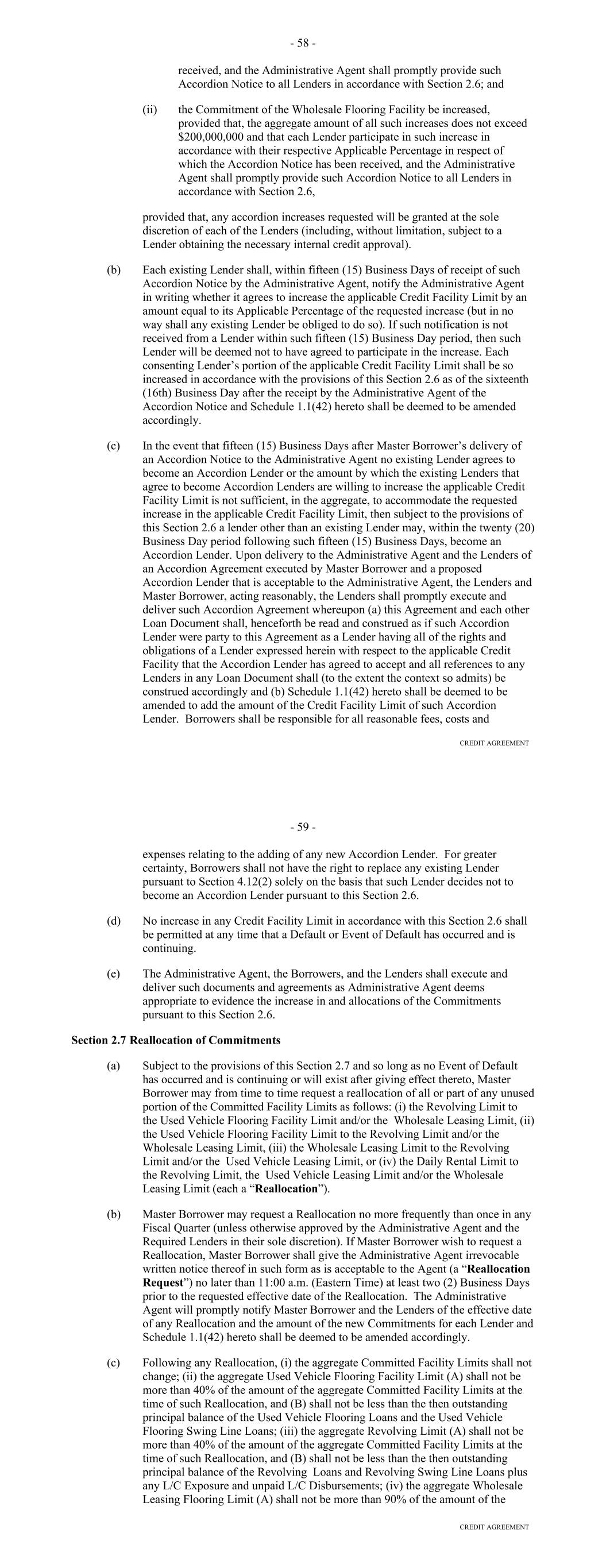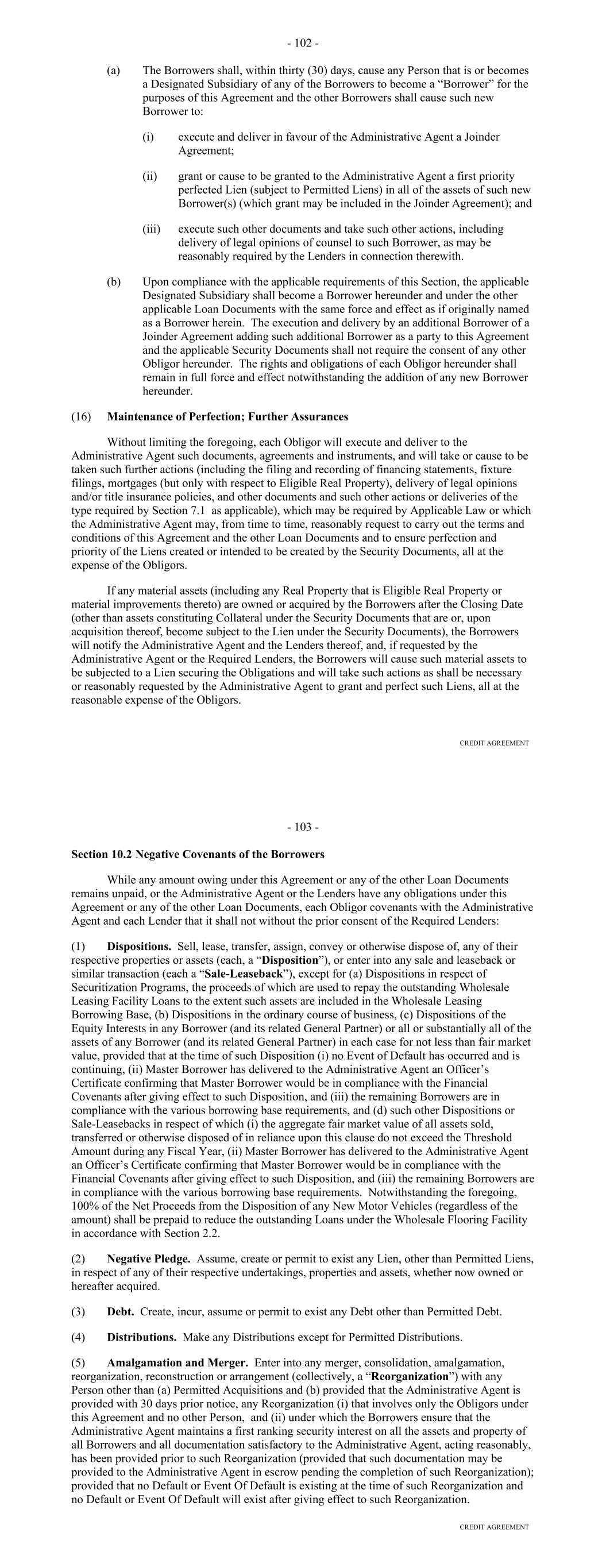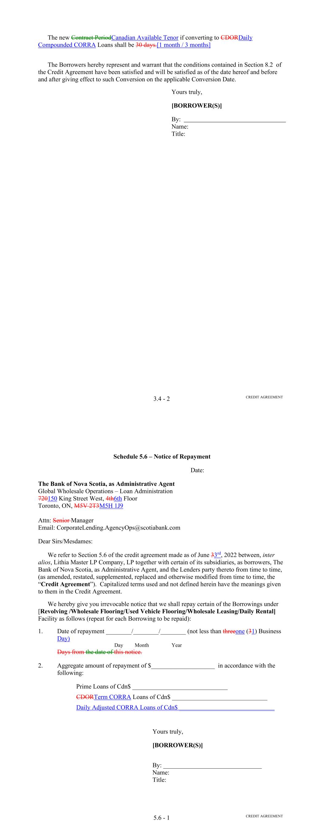Page Section 7.15. Merger or Consolidation, Assumption of Obligations or Resignation of the Servicer 116118 Section 7.16. Responsibilities of the Borrower 117118 Section 7.17. Custody of Receivable Files 117119 Section 7.18. Duties of Collateral Custodian 117119 ARTICLE EIGHT TERMINATION EVENTS Section 8.01. Termination Events 120122 Section 8.02. Actions Upon Declaration of the Occurrence of the Termination Date 123125 Section 8.03. Exercise of Remedies 125127 Section 8.04. Waiver of Certain Laws 125127 Section 8.05. Power of Attorney 125127 ARTICLE NINE INDEMNIFICATION Section 9.01. Indemnities by the Borrower 126128 Section 9.02. Indemnities by the Servicer 128131 Section 9.03. Indemnities by the Backup Servicer in its Capacity as the Successor Servicer 130132 ARTICLE TEN THE ADMINISTRATIVE AGENT AND THE AGENTS Section 10.01. Authorization and Action 130133 Section 10.02. Delegation of Duties 131133 Section 10.03. Exculpatory Provisions 131134 Section 10.04. Reliance 131134 Section 10.05. Non-Reliance on Agents and Other Lenders 132135 Section 10.06. Indemnification 133136 Section 10.07. Agents in their Individual Capacity 133137 Section 10.08. Successor Administrative Agent 134137 Section 10.09. Erroneous Payments. 134138 ARTICLE ELEVEN ASSIGNMENTS; PARTICIPATIONS Section 11.01. Assignments and Participations 135139 iii Page ARTICLE TWELVE MUTUAL COVENANTS REGARDING CONFIDENTIALITY Section 12.01. Covenants of the Borrower, the Servicer, the Backup Servicer, the Account Bank and the Collateral Custodian 138142 Section 12.02. Covenants of the Administrative Agent, the Agents and the Lenders 138142 Section 12.03. Non-Confidentiality of Tax Treatment and Tax Structure 140144 ARTICLE THIRTEEN MISCELLANEOUS Section 13.01. Amendments and Waivers 140144 Section 13.02. Notices, Etc. 141145 Section 13.03. No Waiver, Rights and Remedies 141145 Section 13.04. Binding Effect 141145 Section 13.05. Term of this Agreement 142145 Section 13.06. GOVERNING LAW; CONSENT TO JURISDICTION; WAIVER OF OBJECTION TO VENUE 142146 Section 13.07. WAIVER OF JURY TRIAL 142146 Section 13.08. Costs and Expenses 142146 Section 13.09. No Insolvency Proceedings 143147 Section 13.10. Recourse Against Certain Parties 143147 Section 13.11. Patriot Act Compliance 144148 Section 13.12. Execution in Counterparts; Electronic Signatures; Severability; Integration 144148 Section 13.13. Acknowledgement Regarding Any Supported QFCs 144149 Section 13.14. Right to Set-Off 145150 Section 13.15. Limitation on Consequential, Indirect and Certain Other Damages 146150 Section 13.16. Not a Novation 146151 SCHEDULES Schedule A-1– Lender Supplement (JPMorgan Lender Group) SA-1-1 Schedule A-2– Lender Supplement (Citibank Lender Group) SA-2-1 Schedule B – Eligible Receivable Criteria SB-1 Schedule C – Schedule of Receivables SC-1 Schedule D – Location of Receivable Files SD-1 Schedule E – Schedule of Documents SE-1 Schedule F – Financial Covenants (Lithia) SF-1 Schedule G – Approved Backup Servicers SG-1 iv