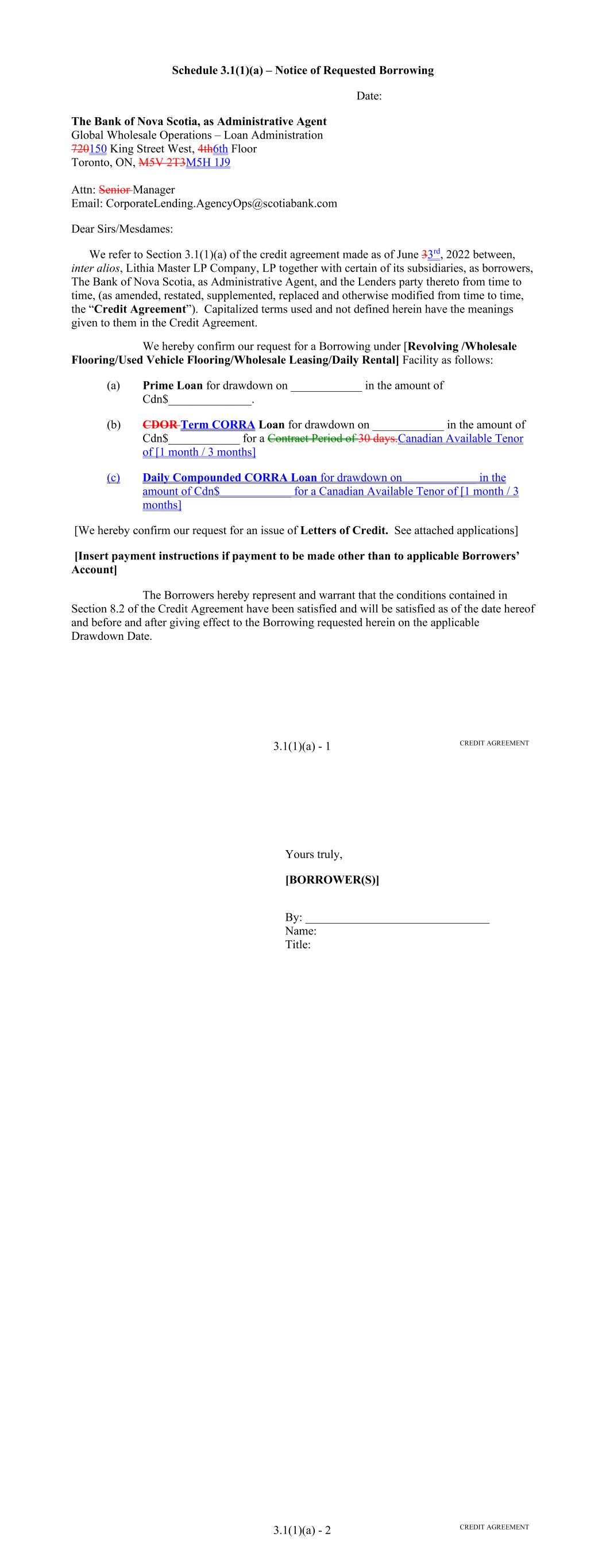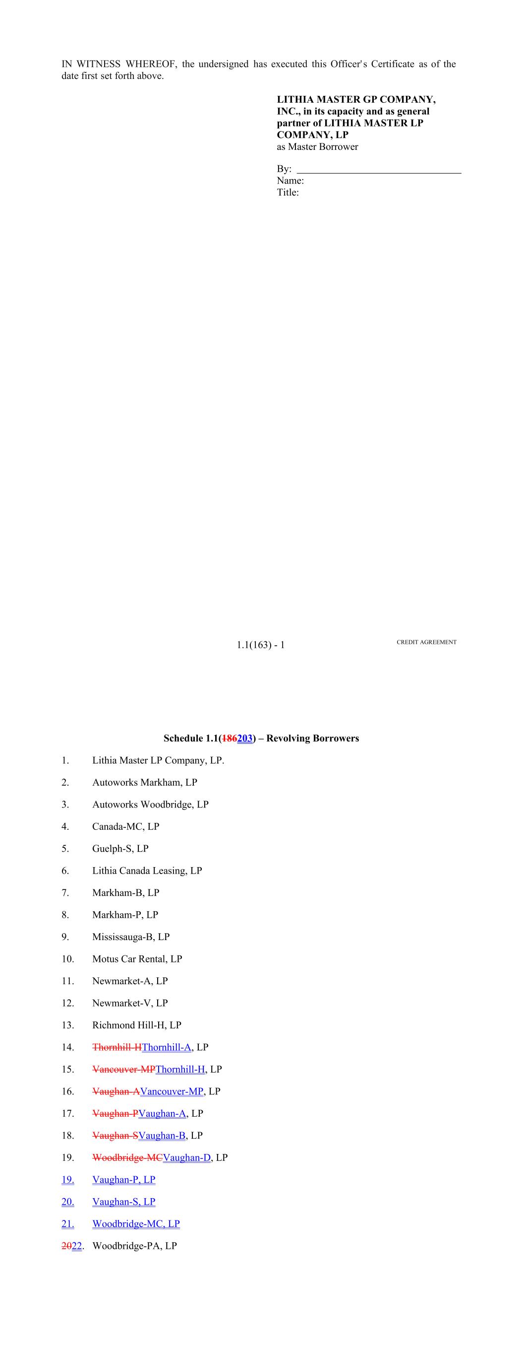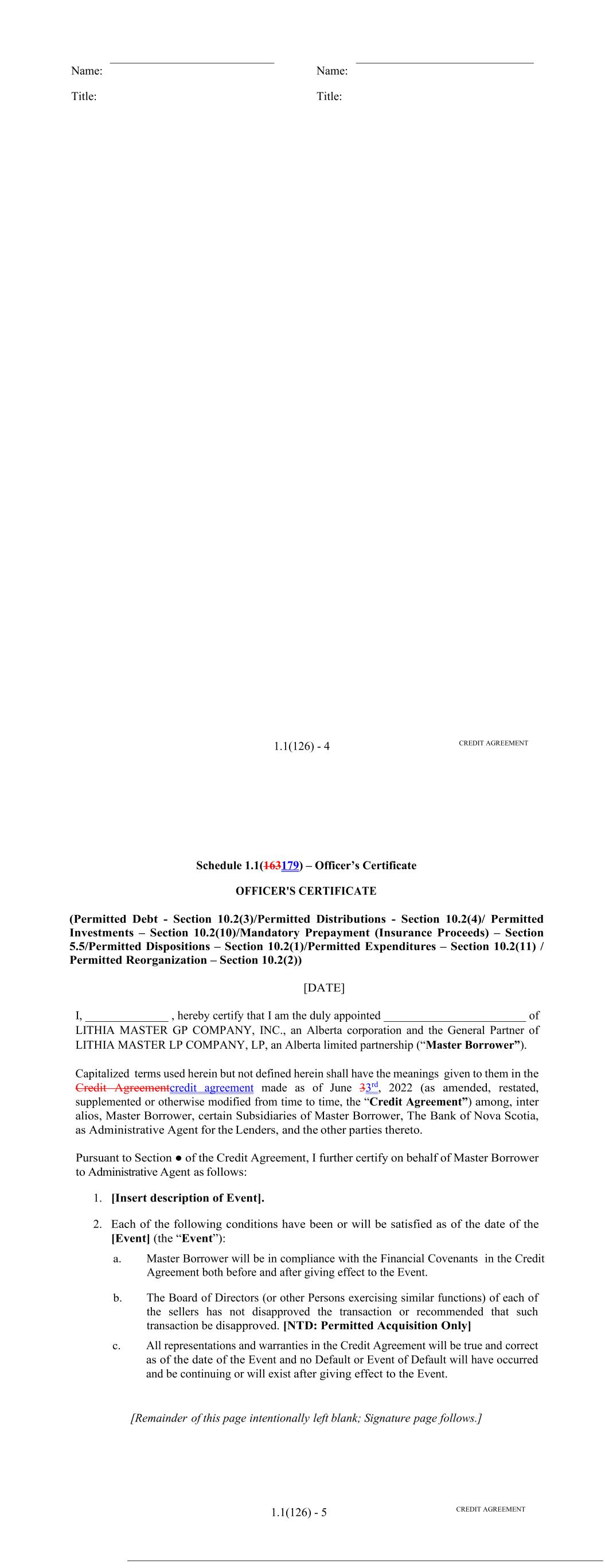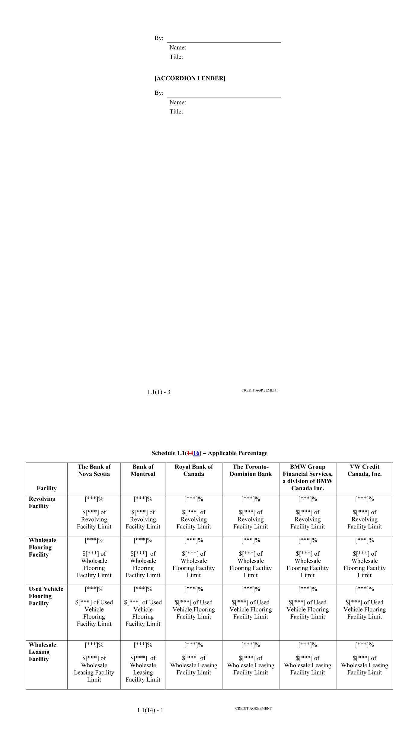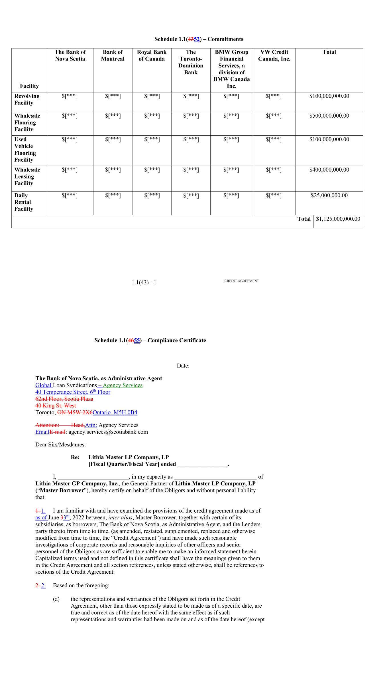 Page Section 7.15. Merger or Consolidation, Assumption of Obligations or Resignation of the Servicer 116118 Section 7.16. Responsibilities of the Borrower 117118 Section 7.17. Custody of Receivable Files 117119 Section 7.18. Duties of Collateral Custodian 117119 ARTICLE EIGHT TERMINATION EVENTS Section 8.01. Termination Events 120122 Section 8.02. Actions Upon Declaration of the Occurrence of the Termination Date 123125 Section 8.03. Exercise of Remedies 125127 Section 8.04. Waiver of Certain Laws 125127 Section 8.05. Power of Attorney 125127 ARTICLE NINE INDEMNIFICATION Section 9.01. Indemnities by the Borrower 126128 Section 9.02. Indemnities by the Servicer 128131 Section 9.03. Indemnities by the Backup Servicer in its Capacity as the Successor Servicer 130132 ARTICLE TEN THE ADMINISTRATIVE AGENT AND THE AGENTS Section 10.01. Authorization and Action 130133 Section 10.02. Delegation of Duties 131133 Section 10.03. Exculpatory Provisions 131134 Section 10.04. Reliance 131134 Section 10.05. Non-Reliance on Agents and Other Lenders 132135 Section 10.06. Indemnification 133136 Section 10.07. Agents in their Individual Capacity 133137 Section 10.08. Successor Administrative Agent 134137 Section 10.09. Erroneous Payments. 134138 ARTICLE ELEVEN ASSIGNMENTS; PARTICIPATIONS Section 11.01. Assignments and Participations 135139 iii Page ARTICLE TWELVE MUTUAL COVENANTS REGARDING CONFIDENTIALITY Section 12.01. Covenants of the Borrower, the Servicer, the Backup Servicer, the Account Bank and the Collateral Custodian 138142 Section 12.02. Covenants of the Administrative Agent, the Agents and the Lenders 138142 Section 12.03. Non-Confidentiality of Tax Treatment and Tax Structure 140144 ARTICLE THIRTEEN MISCELLANEOUS Section 13.01. Amendments and Waivers 140144 Section 13.02. Notices, Etc. 141145 Section 13.03. No Waiver, Rights and Remedies 141145 Section 13.04. Binding Effect 141145 Section 13.05. Term of this Agreement 142145 Section 13.06. GOVERNING LAW; CONSENT TO JURISDICTION; WAIVER OF OBJECTION TO VENUE 142146 Section 13.07. WAIVER OF JURY TRIAL 142146 Section 13.08. Costs and Expenses 142146 Section 13.09. No Insolvency Proceedings 143147 Section 13.10. Recourse Against Certain Parties 143147 Section 13.11. Patriot Act Compliance 144148 Section 13.12. Execution in Counterparts; Electronic Signatures; Severability; Integration 144148 Section 13.13. Acknowledgement Regarding Any Supported QFCs 144149 Section 13.14. Right to Set-Off 145150 Section 13.15. Limitation on Consequential, Indirect and Certain Other Damages 146150 Section 13.16. Not a Novation 146151 SCHEDULES Schedule A-1– Lender Supplement (JPMorgan Lender Group) SA-1-1 Schedule A-2– Lender Supplement (Citibank Lender Group) SA-2-1 Schedule B – Eligible Receivable Criteria SB-1 Schedule C – Schedule of Receivables SC-1 Schedule D – Location of Receivable Files SD-1 Schedule E – Schedule of Documents SE-1 Schedule F – Financial Covenants (Lithia) SF-1 Schedule G – Approved Backup Servicers SG-1 iv