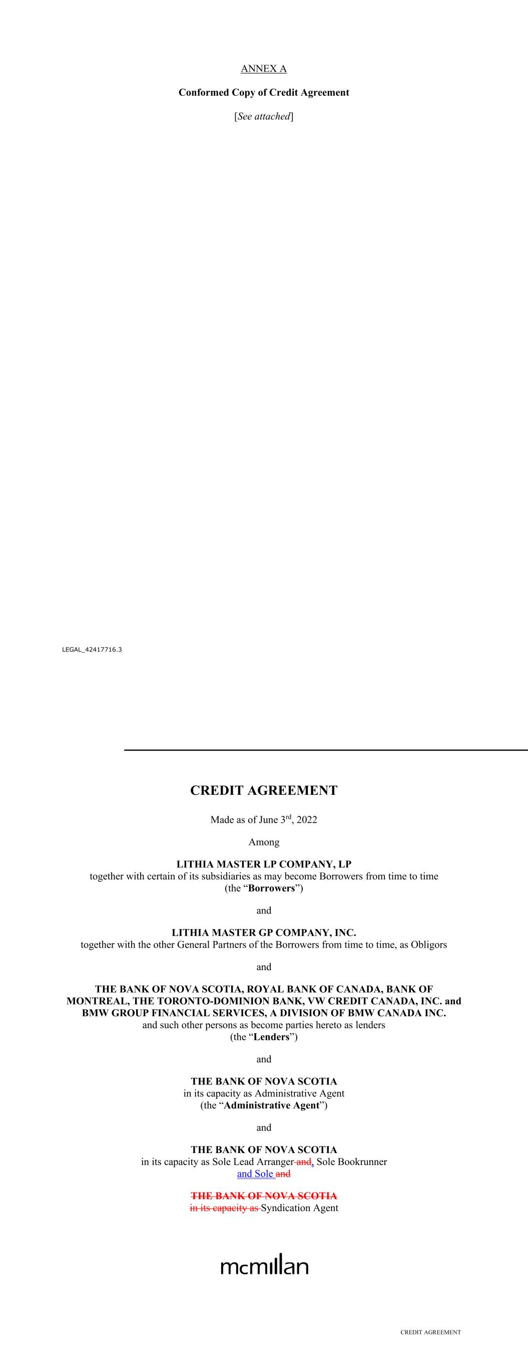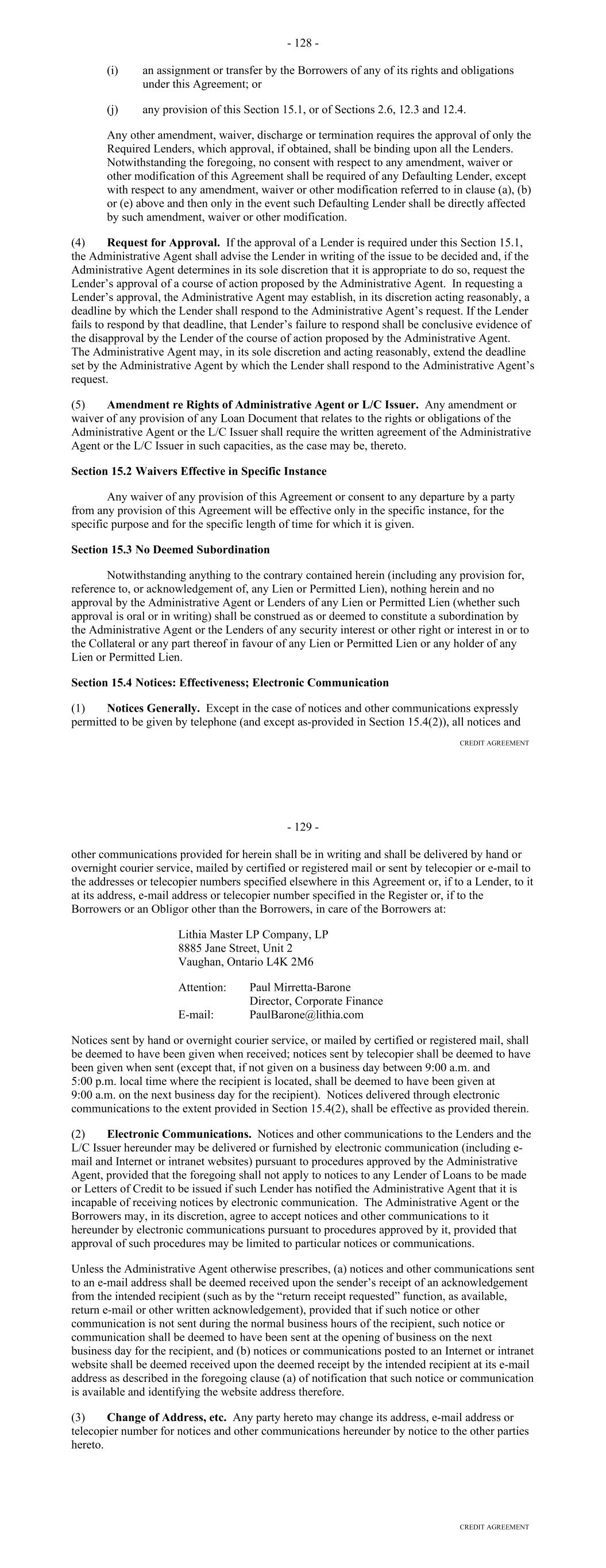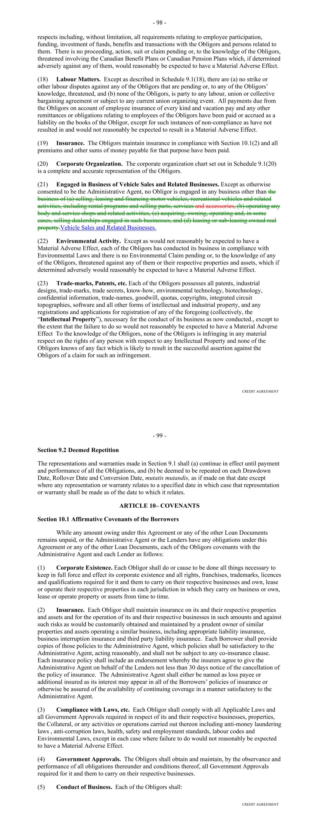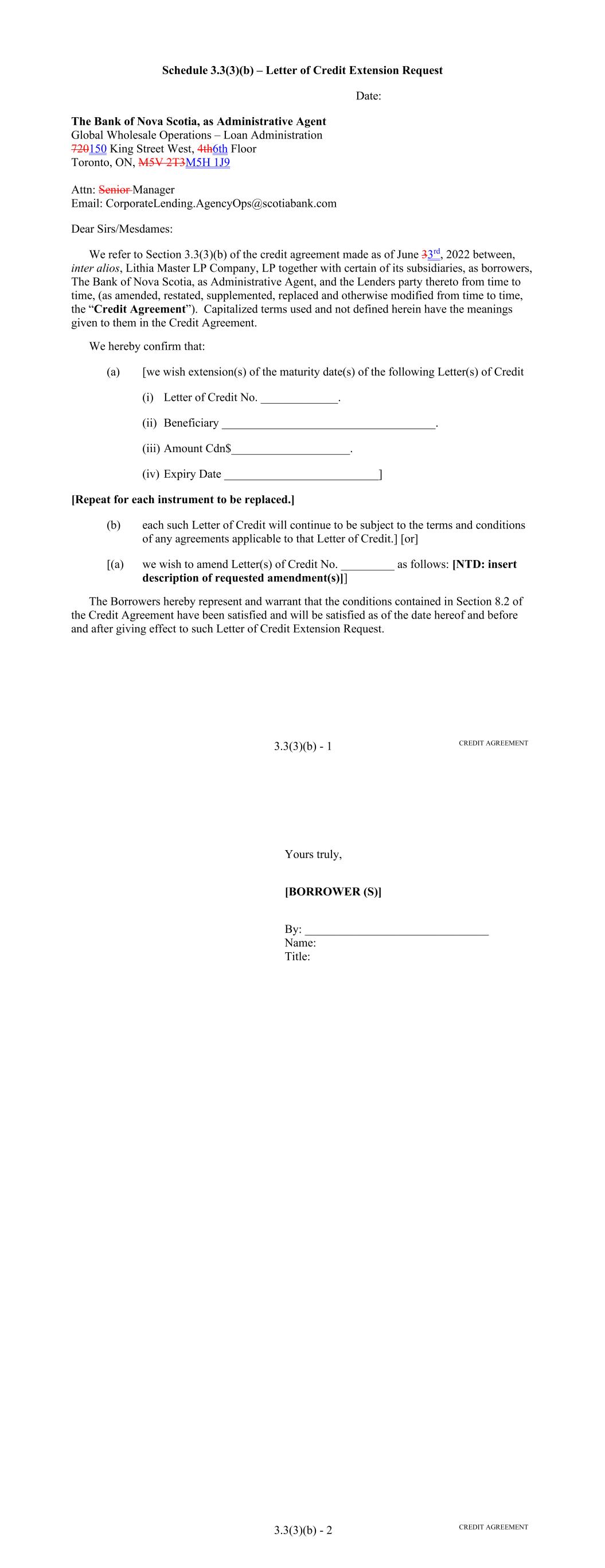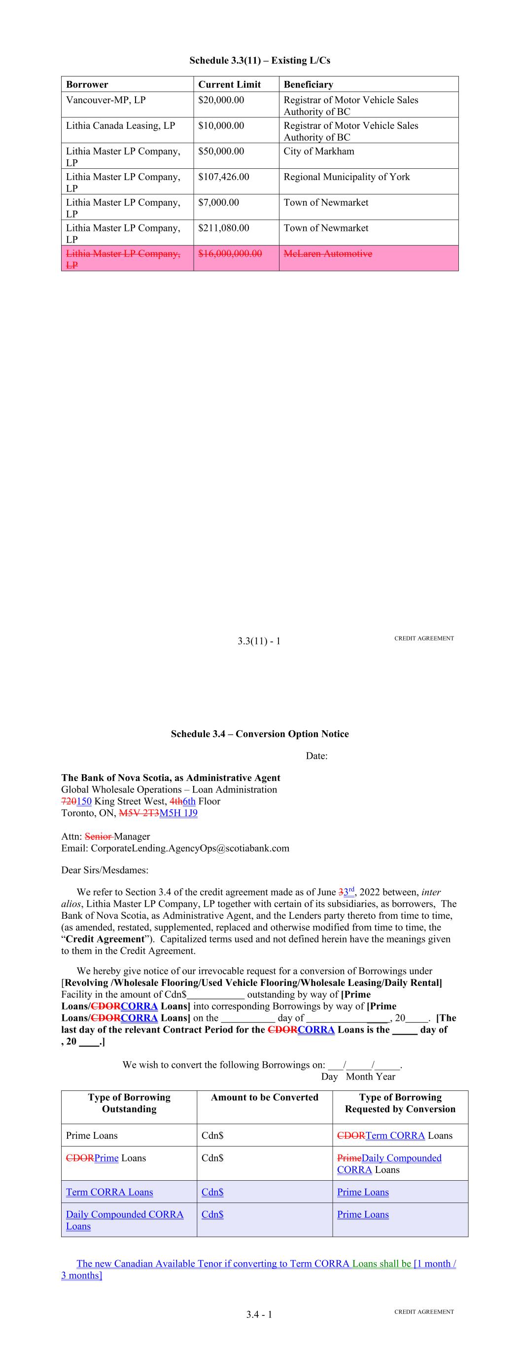 Page Section 7.15. Merger or Consolidation, Assumption of Obligations or Resignation of the Servicer 116118 Section 7.16. Responsibilities of the Borrower 117118 Section 7.17. Custody of Receivable Files 117119 Section 7.18. Duties of Collateral Custodian 117119 ARTICLE EIGHT TERMINATION EVENTS Section 8.01. Termination Events 120122 Section 8.02. Actions Upon Declaration of the Occurrence of the Termination Date 123125 Section 8.03. Exercise of Remedies 125127 Section 8.04. Waiver of Certain Laws 125127 Section 8.05. Power of Attorney 125127 ARTICLE NINE INDEMNIFICATION Section 9.01. Indemnities by the Borrower 126128 Section 9.02. Indemnities by the Servicer 128131 Section 9.03. Indemnities by the Backup Servicer in its Capacity as the Successor Servicer 130132 ARTICLE TEN THE ADMINISTRATIVE AGENT AND THE AGENTS Section 10.01. Authorization and Action 130133 Section 10.02. Delegation of Duties 131133 Section 10.03. Exculpatory Provisions 131134 Section 10.04. Reliance 131134 Section 10.05. Non-Reliance on Agents and Other Lenders 132135 Section 10.06. Indemnification 133136 Section 10.07. Agents in their Individual Capacity 133137 Section 10.08. Successor Administrative Agent 134137 Section 10.09. Erroneous Payments. 134138 ARTICLE ELEVEN ASSIGNMENTS; PARTICIPATIONS Section 11.01. Assignments and Participations 135139 iii Page ARTICLE TWELVE MUTUAL COVENANTS REGARDING CONFIDENTIALITY Section 12.01. Covenants of the Borrower, the Servicer, the Backup Servicer, the Account Bank and the Collateral Custodian 138142 Section 12.02. Covenants of the Administrative Agent, the Agents and the Lenders 138142 Section 12.03. Non-Confidentiality of Tax Treatment and Tax Structure 140144 ARTICLE THIRTEEN MISCELLANEOUS Section 13.01. Amendments and Waivers 140144 Section 13.02. Notices, Etc. 141145 Section 13.03. No Waiver, Rights and Remedies 141145 Section 13.04. Binding Effect 141145 Section 13.05. Term of this Agreement 142145 Section 13.06. GOVERNING LAW; CONSENT TO JURISDICTION; WAIVER OF OBJECTION TO VENUE 142146 Section 13.07. WAIVER OF JURY TRIAL 142146 Section 13.08. Costs and Expenses 142146 Section 13.09. No Insolvency Proceedings 143147 Section 13.10. Recourse Against Certain Parties 143147 Section 13.11. Patriot Act Compliance 144148 Section 13.12. Execution in Counterparts; Electronic Signatures; Severability; Integration 144148 Section 13.13. Acknowledgement Regarding Any Supported QFCs 144149 Section 13.14. Right to Set-Off 145150 Section 13.15. Limitation on Consequential, Indirect and Certain Other Damages 146150 Section 13.16. Not a Novation 146151 SCHEDULES Schedule A-1– Lender Supplement (JPMorgan Lender Group) SA-1-1 Schedule A-2– Lender Supplement (Citibank Lender Group) SA-2-1 Schedule B – Eligible Receivable Criteria SB-1 Schedule C – Schedule of Receivables SC-1 Schedule D – Location of Receivable Files SD-1 Schedule E – Schedule of Documents SE-1 Schedule F – Financial Covenants (Lithia) SF-1 Schedule G – Approved Backup Servicers SG-1 iv