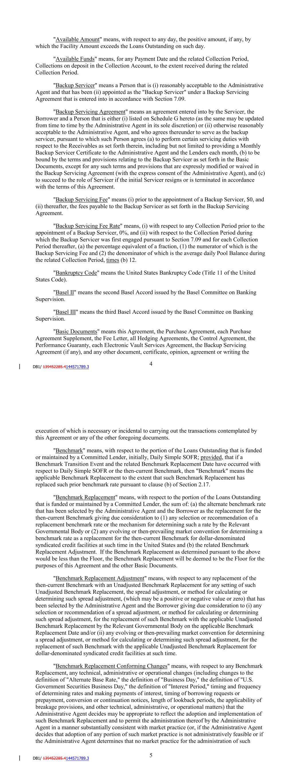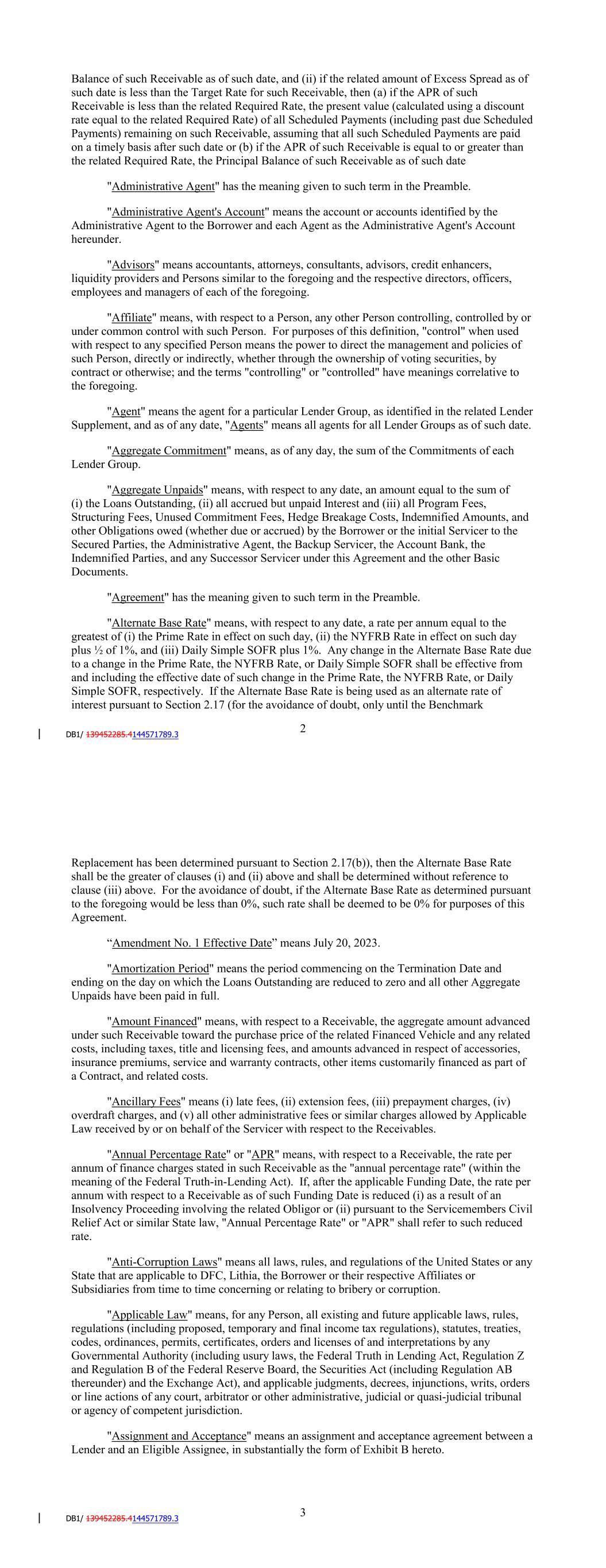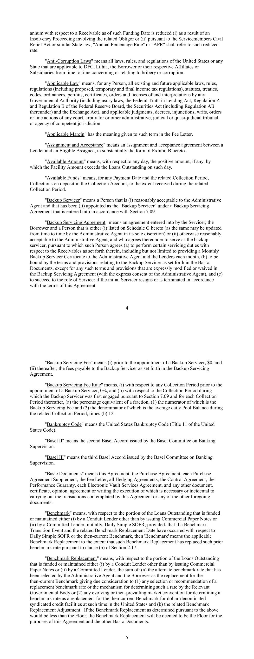 annum with respect to a Receivable as of such Funding Date is reduced (i) as a result of an Insolvency Proceeding involving the related Obligor or (ii) pursuant to the Servicemembers Civil Relief Act or similar State law, "Annual Percentage Rate" or "APR" shall refer to such reduced rate. "Anti-Corruption Laws" means all laws, rules, and regulations of the United States or any State that are applicable to DFC, Lithia, the Borrower or their respective Affiliates or Subsidiaries from time to time concerning or relating to bribery or corruption. "Applicable Law" means, for any Person, all existing and future applicable laws, rules, regulations (including proposed, temporary and final income tax regulations), statutes, treaties, codes, ordinances, permits, certificates, orders and licenses of and interpretations by any Governmental Authority (including usury laws, the Federal Truth in Lending Act, Regulation Z and Regulation B of the Federal Reserve Board, the Securities Act (including Regulation AB thereunder) and the Exchange Act), and applicable judgments, decrees, injunctions, writs, orders or line actions of any court, arbitrator or other administrative, judicial or quasi-judicial tribunal or agency of competent jurisdiction. "Applicable Margin" has the meaning given to such term in the Fee Letter. "Assignment and Acceptance" means an assignment and acceptance agreement between a Lender and an Eligible Assignee, in substantially the form of Exhibit B hereto. "Available Amount" means, with respect to any day, the positive amount, if any, by which the Facility Amount exceeds the Loans Outstanding on such day. "Available Funds" means, for any Payment Date and the related Collection Period, Collections on deposit in the Collection Account, to the extent received during the related Collection Period. "Backup Servicer" means a Person that is (i) reasonably acceptable to the Administrative Agent and that has been (ii) appointed as the "Backup Servicer" under a Backup Servicing Agreement that is entered into in accordance with Section 7.09. "Backup Servicing Agreement" means an agreement entered into by the Servicer, the Borrower and a Person that is either (i) listed on Schedule G hereto (as the same may be updated from time to time by the Administrative Agent in its sole discretion) or (ii) otherwise reasonably acceptable to the Administrative Agent, and who agrees thereunder to serve as the backup servicer, pursuant to which such Person agrees (a) to perform certain servicing duties with respect to the Receivables as set forth therein, including but not limited to providing a Monthly Backup Servicer Certificate to the Administrative Agent and the Lenders each month, (b) to be bound by the terms and provisions relating to the Backup Servicer as set forth in the Basic Documents, except for any such terms and provisions that are expressly modified or waived in the Backup Servicing Agreement (with the express consent of the Administrative Agent), and (c) to succeed to the role of Servicer if the initial Servicer resigns or is terminated in accordance with the terms of this Agreement. 4 "Backup Servicing Fee" means (i) prior to the appointment of a Backup Servicer, $0, and (ii) thereafter, the fees payable to the Backup Servicer as set forth in the Backup Servicing Agreement. "Backup Servicing Fee Rate" means, (i) with respect to any Collection Period prior to the appointment of a Backup Servicer, 0%, and (ii) with respect to the Collection Period during which the Backup Servicer was first engaged pursuant to Section 7.09 and for each Collection Period thereafter, (a) the percentage equivalent of a fraction, (1) the numerator of which is the Backup Servicing Fee and (2) the denominator of which is the average daily Pool Balance during the related Collection Period, times (b) 12. "Bankruptcy Code" means the United States Bankruptcy Code (Title 11 of the United States Code). "Basel II" means the second Basel Accord issued by the Basel Committee on Banking Supervision. "Basel III" means the third Basel Accord issued by the Basel Committee on Banking Supervision. "Basic Documents" means this Agreement, the Purchase Agreement, each Purchase Agreement Supplement, the Fee Letter, all Hedging Agreements, the Control Agreement, the Performance Guaranty, each Electronic Vault Services Agreement, and any other document, certificate, opinion, agreement or writing the execution of which is necessary or incidental to carrying out the transactions contemplated by this Agreement or any of the other foregoing documents. "Benchmark" means, with respect to the portion of the Loans Outstanding that is funded or maintained either (i) by a Conduit Lender other than by issuing Commercial Paper Notes or (ii) by a Committed Lender, initially, Daily Simple SOFR; provided, that if a Benchmark Transition Event and the related Benchmark Replacement Date have occurred with respect to Daily Simple SOFR or the then-current Benchmark, then 'Benchmark' means the applicable Benchmark Replacement to the extent that such Benchmark Replacement has replaced such prior benchmark rate pursuant to clause (b) of Section 2.17. "Benchmark Replacement" means, with respect to the portion of the Loans Outstanding that is funded or maintained either (i) by a Conduit Lender other than by issuing Commercial Paper Notes or (ii) by a Committed Lender, the sum of: (a) the alternate benchmark rate that has been selected by the Administrative Agent and the Borrower as the replacement for the then-current Benchmark giving due consideration to (1) any selection or recommendation of a replacement benchmark rate or the mechanism for determining such a rate by the Relevant Governmental Body or (2) any evolving or then-prevailing market convention for determining a benchmark rate as a replacement for the then-current Benchmark for dollar-denominated syndicated credit facilities at such time in the United States and (b) the related Benchmark Replacement Adju